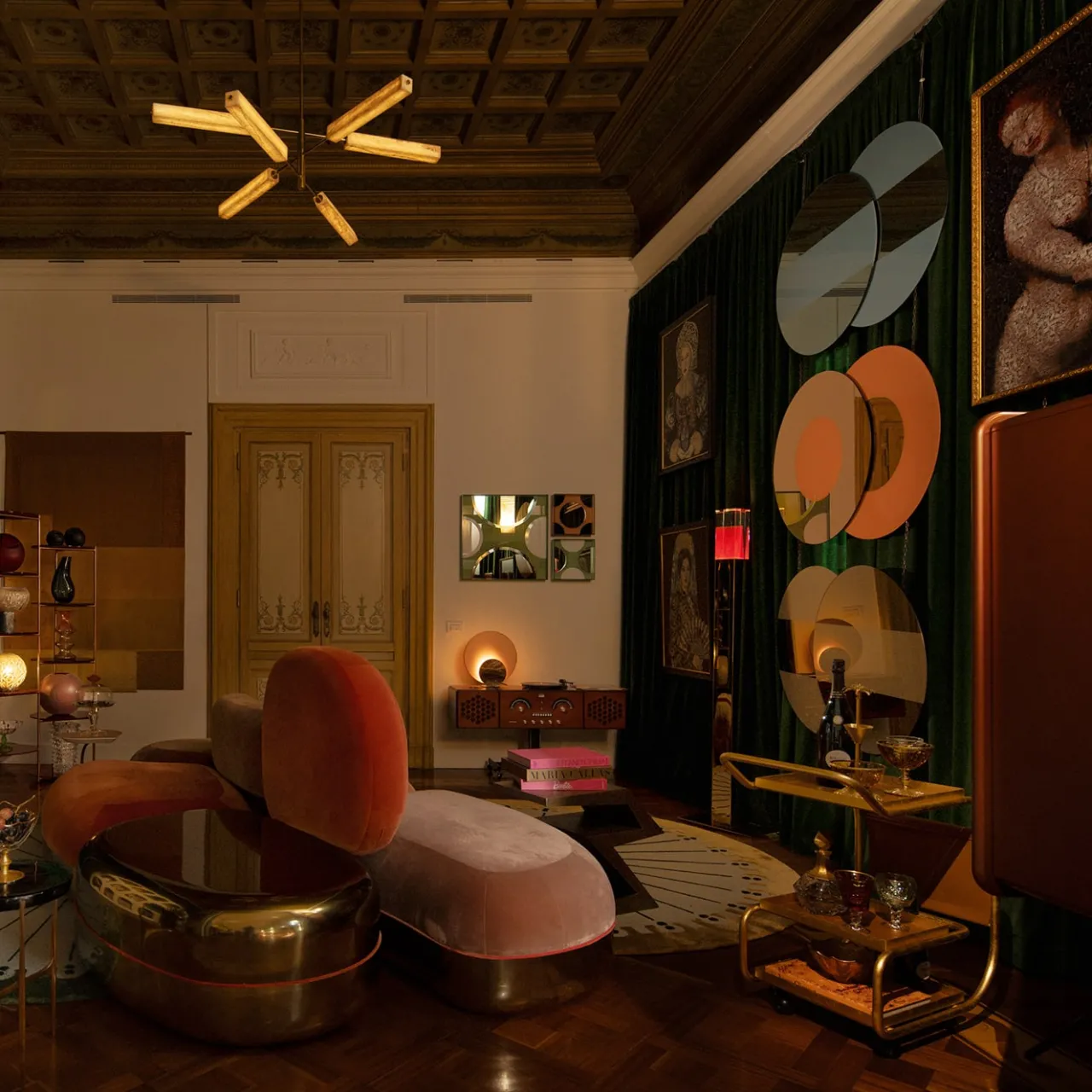 Questo superbo carrello da bar è stato concepito all’insegna dell’opulenza e della funzionalità. Rifinito in foglia d’oro per una dichiarazione di lusso, il suo sinuoso telaio in tubolare d’acciaio è dotato di tre vassoi – uno dei quali rimovibile – dove raccogliere liquori e set di tumbler per sofisticati momenti di dopocena. Una pratica tasca e i fondi dei vassoi sono in pregiata pelle restaurata. Le ruote pivottanti completano il design.