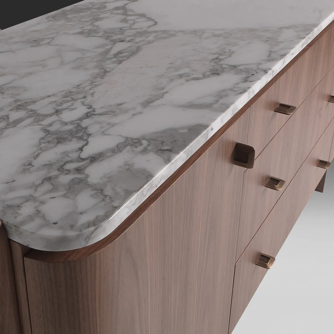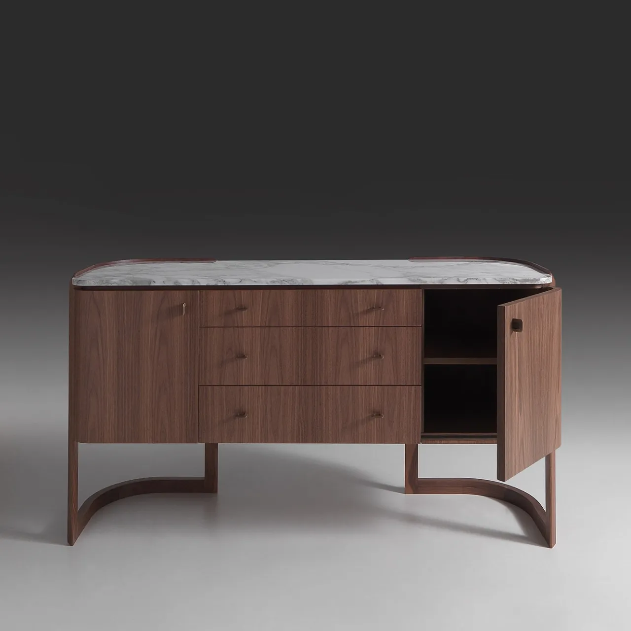 Elegante e raffinato, questo comò è realizzato artigianalmente in legno di noce canaletto, arricchito da uno splendido piano in marmo Calacatta di prima scelta. Dotato di tre cassetti e due ante laterali, è personalizzabile con altri tipi di marmo o con un piano in legno. Consultare il Concierge per ulteriori informazioni ed eventuali variazioni di prezzo.