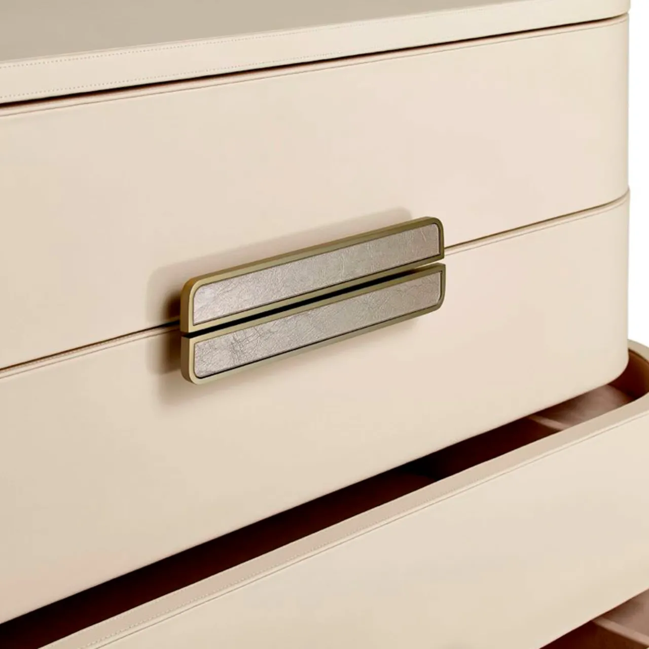 Una cassettiera che si distingue per il suo design sobrio ed elegante, semplice e allo stesso tempo distintivo. Le raffinate maniglie con inserti in vetroresina riflettono la cura dei dettagli.