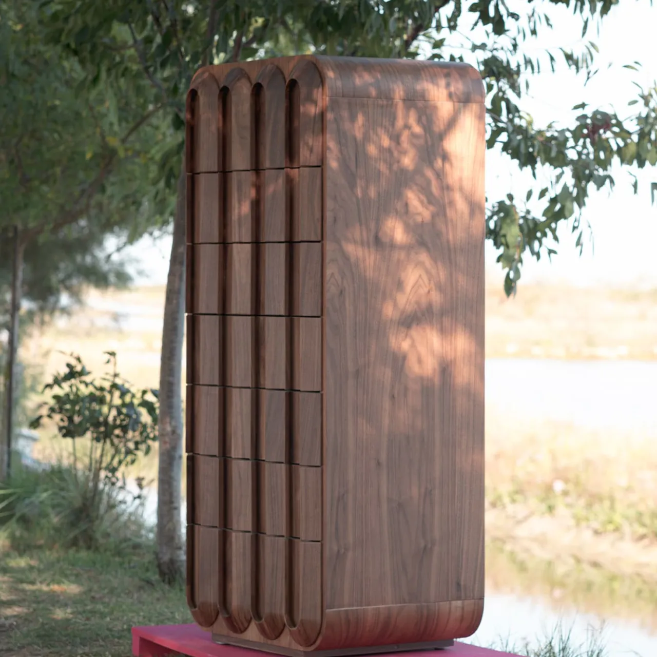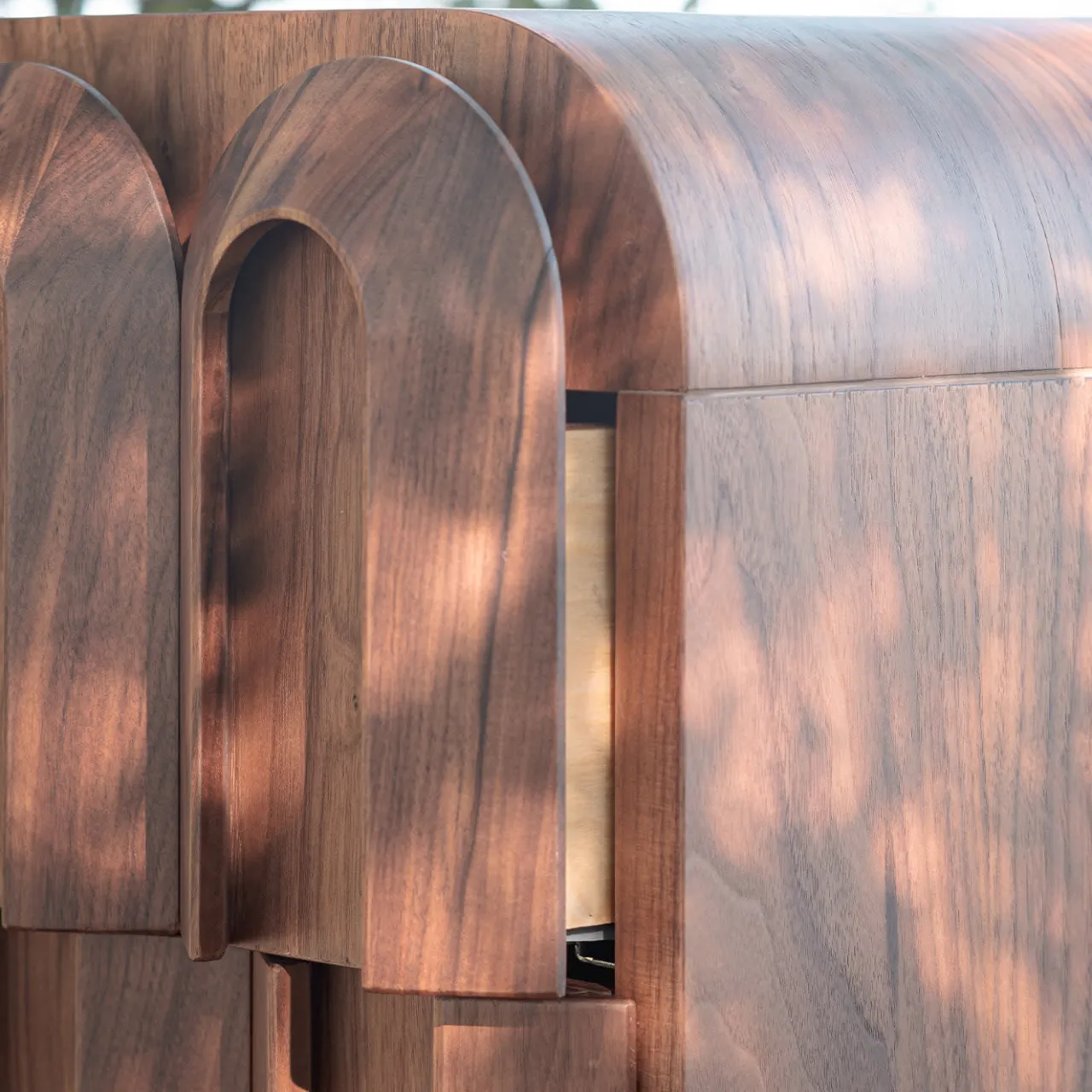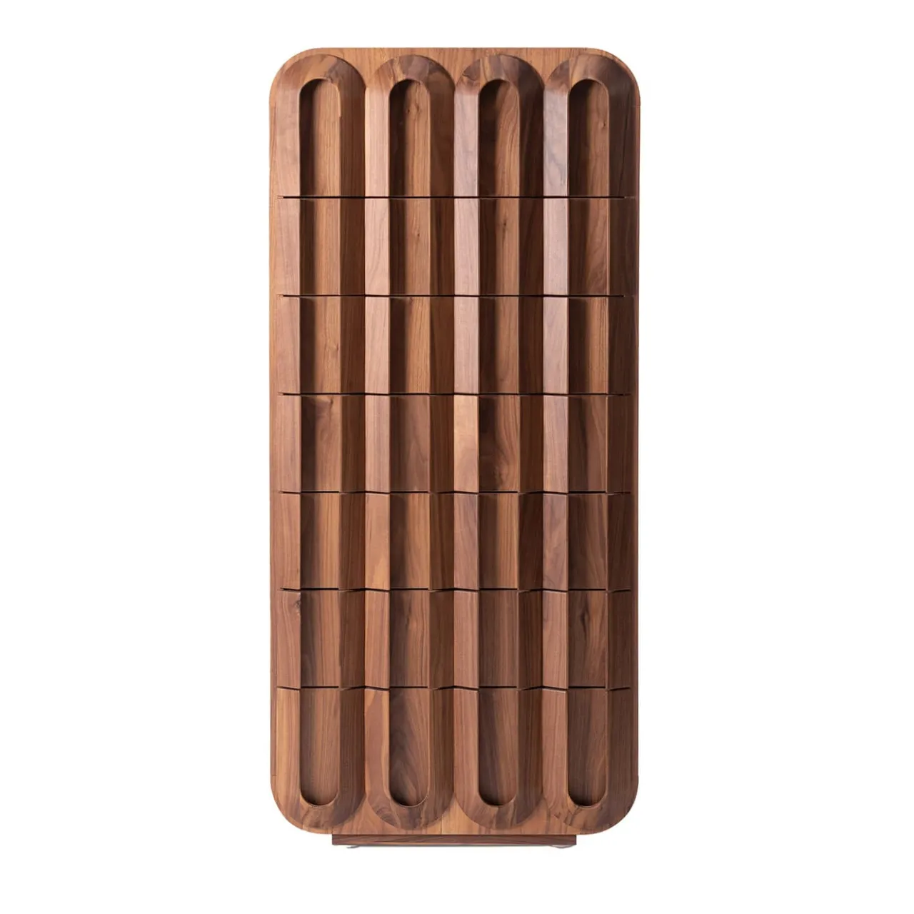 Splendida dimostrazione di artigianato tradizionale e celebrazione del legno, questa splendida cassettiera sarà un’aggiunta singolare all’arredamento di una camera da letto calda e accogliente. Realizzato in noce canaletto, presenta sette cassetti caratterizzati da una serie di archi strutturati in legno massiccio, fresati con eccezionale maestria.
