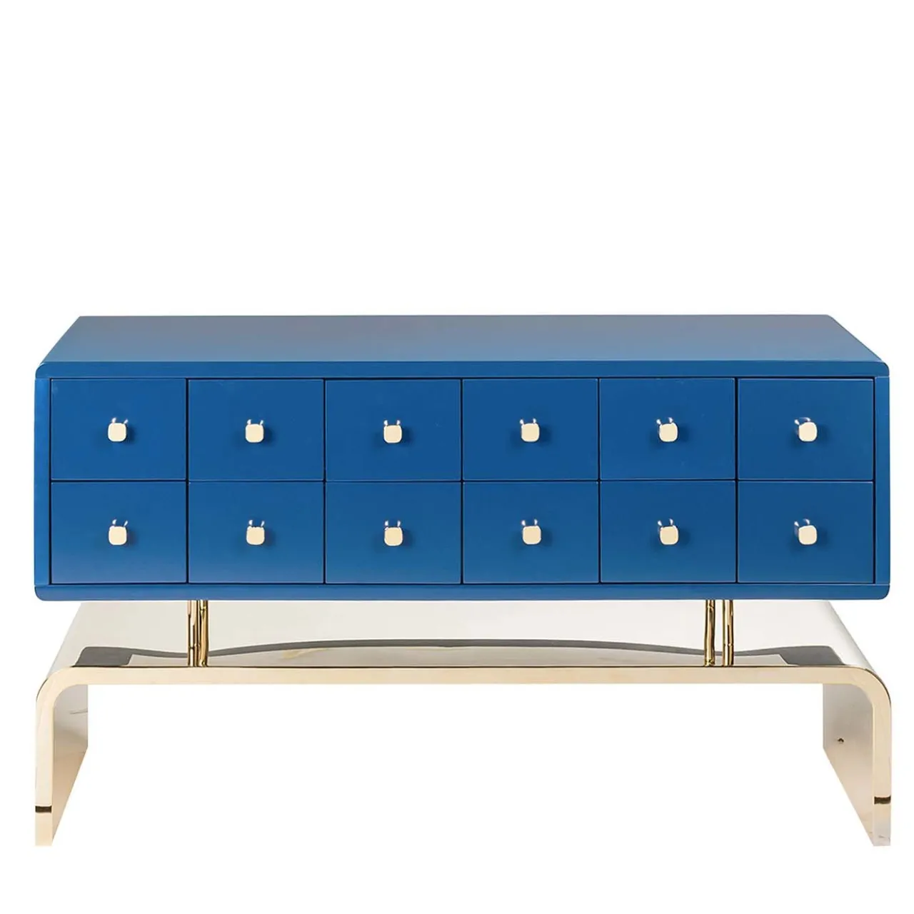Disegnata da Lea Chen, questa elegante cassettiera combina lo stile tradizionale dei mobili cinesi con la raffinatezza contemporanea, creando un contenitore straordinario che arricchirà l’aspetto di un interno moderno. Utilizzata come credenza in un soggiorno o in una sala da pranzo o esposta in camera da letto, questa cassettiera unica sarà un’aggiunta versatile ed elegante a un interno raffinato. La struttura in acciaio è rivestita in oro 24k con il corpo rettangolare e 12 cassetti quadrati laccati in blu opaco con un fondo in rosso per gli interni dei cassetti.