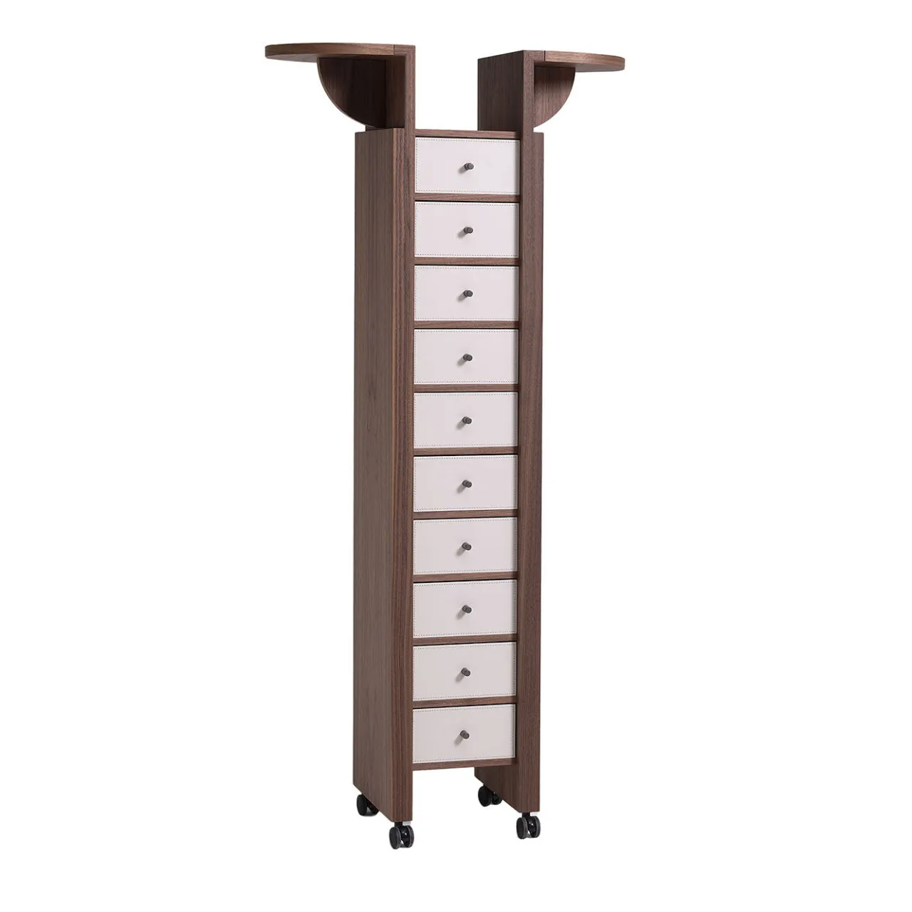 La cassettiera cocker 10 in legno e pelle combina proporzioni essenziali con un’eleganza sobria, caratterizzato da cassetti multipli rivestiti in morbida pelle che si alternano a una struttura in legno raffinato. I vassoi laterali integrati nella parte superiore offrono superfici versatili per esposizione o utilità. Progettato su ruote per la mobilità, questo pezzo bilancia la funzionalità di stoccaggio con un’estetica moderna che si adatta a vari ambienti domestici. Perfetto per organizzare gli oggetti essenziali quotidiani mentre aggiunge un tocco sofisticato.