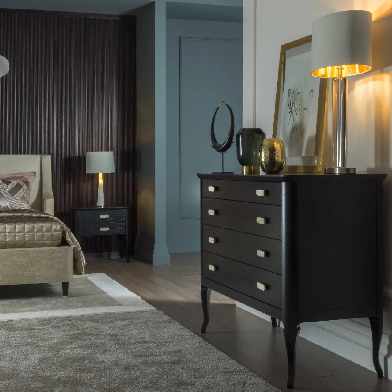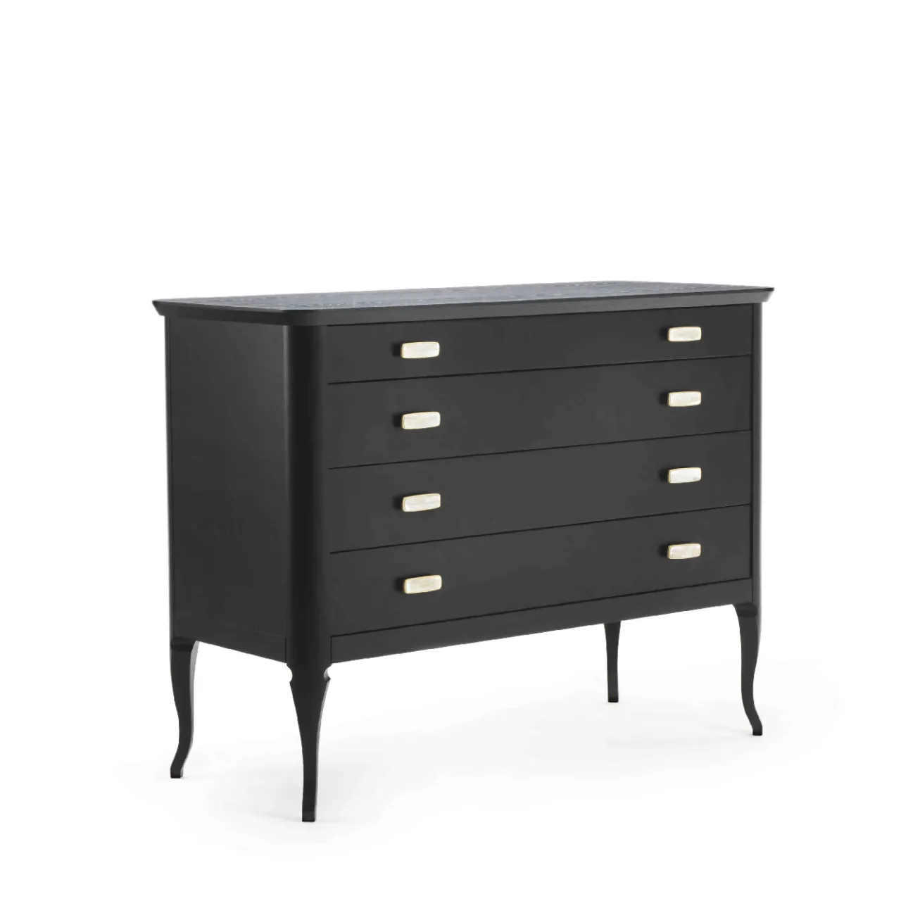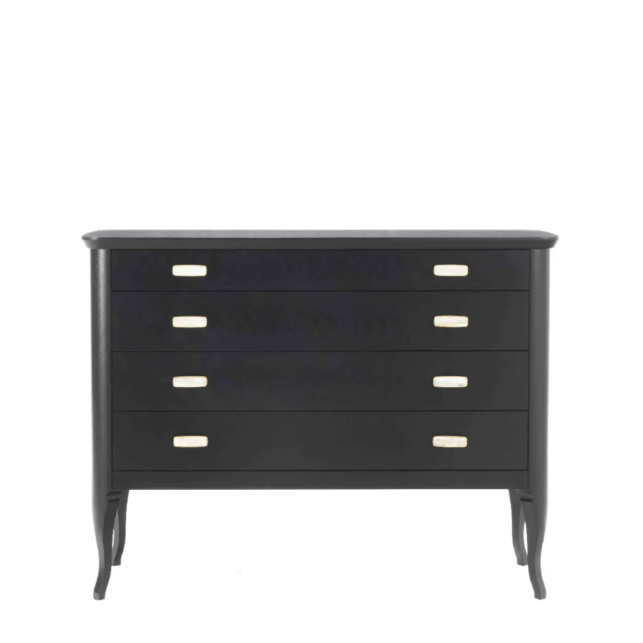 Estetica minimale e design funzionale definiscono questa squisita cassettiera che si adatta perfettamente a un soggiorno o a una camera da letto moderni e classici. Sostenuto da una struttura in legno impiallacciato di frassino con finitura ebanizzata, questo comò ha lati arrotondati e uno splendido piano con bordo esteso e arrotondato sostenuto da gambe in stile cabriole. Evocando l’eleganza dei mobili classici, questo mobile presenta due eleganti maniglie in ottone Art Déco con inserti in corno di bufalo su ciascuno dei quattro cassetti dotati di tecnologia Blumotion a chiusura ammortizzata. Questo design semplice ma chic eleva lo stile di qualsiasi arredamento.