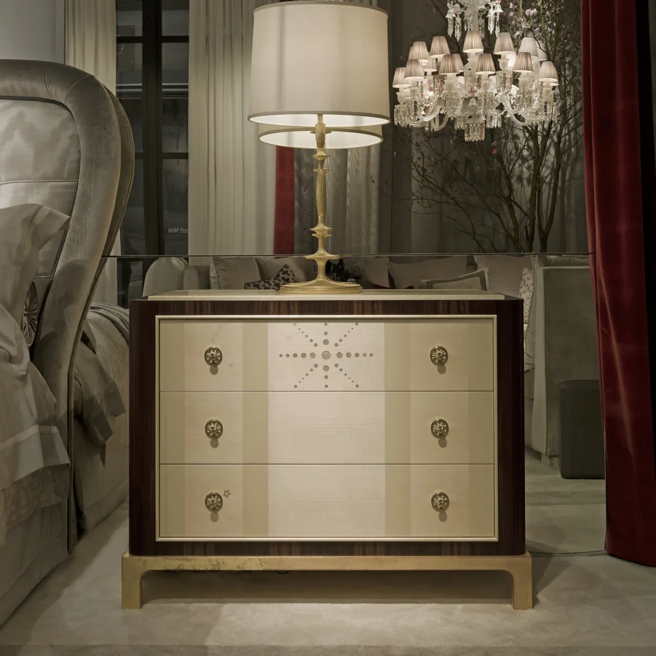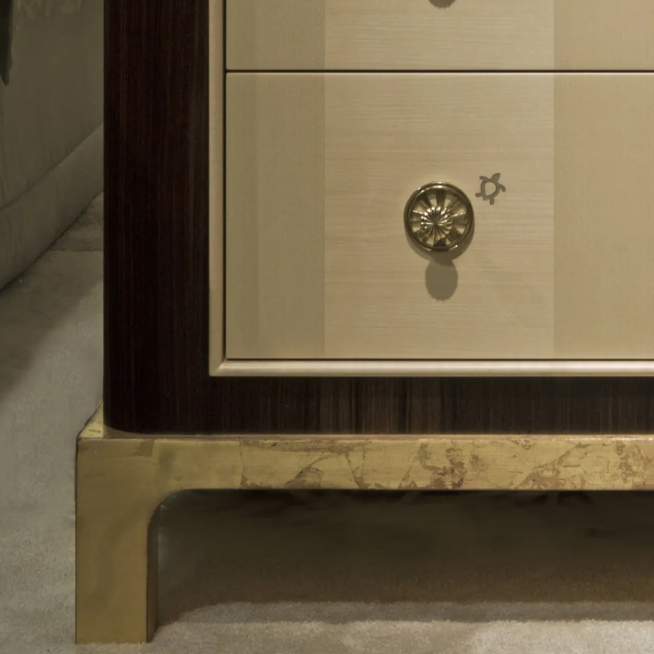 Questo comò è stato realizzato a mano in palissandro e acero, un pezzo di arredamento funzionale che arricchirà una camera da letto classica o contemporanea. Il contrasto tra le tonalità calde e scure del palissandro e il color miele dell’acero crea una combinazione di colori unica nel suo genere, impreziosita dagli intarsi in acero sui pannelli dei tre cassetti. Gli inserti in madreperla e la maniglia in ottone completano il superbo frontale, mentre la base è in legno Toulipier con una lussuosa finitura dorata e il piano è in marmo Giallo Atlantide.