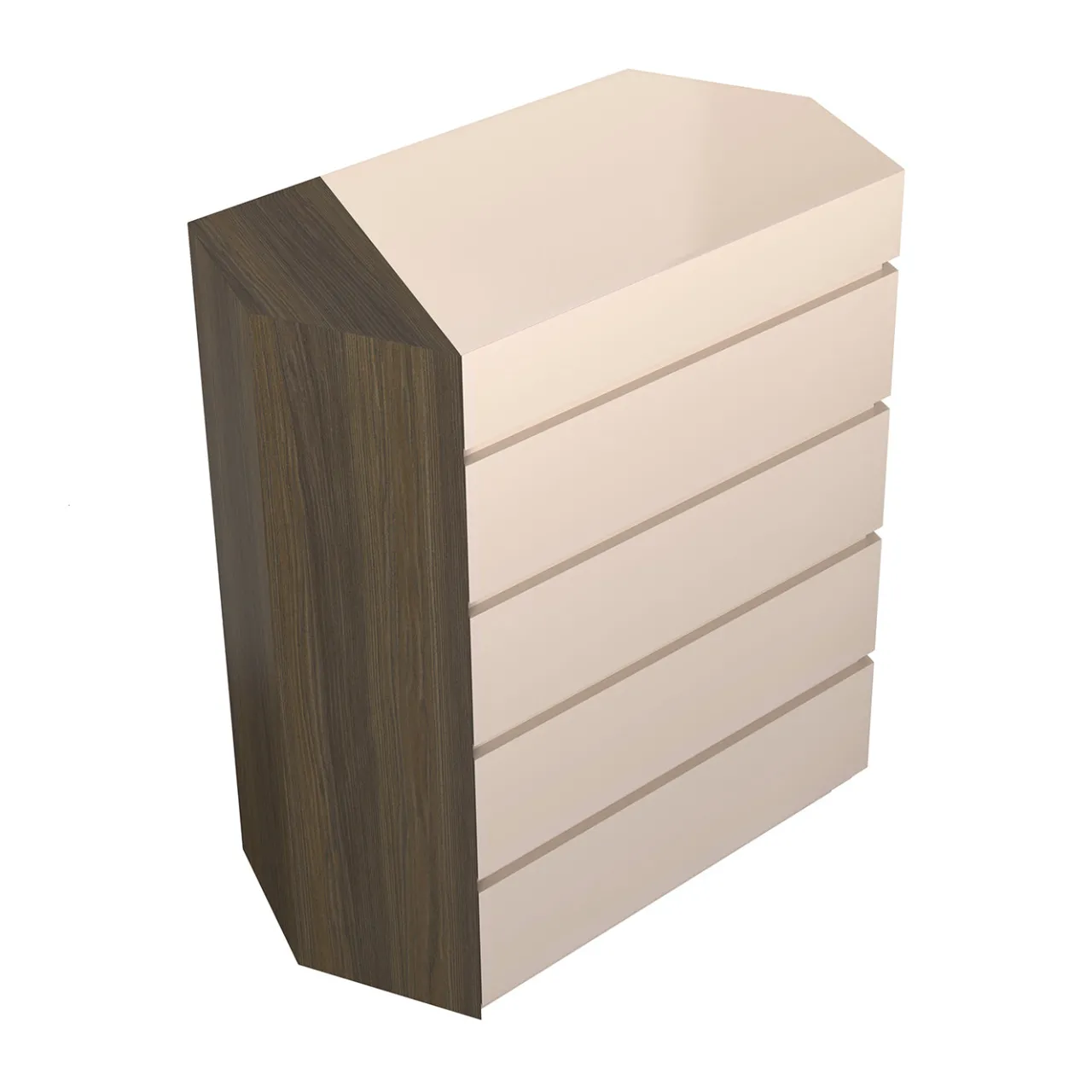 Questo comò presenta un design moderno e minimalista caratterizzato da linee pulite e affilate che creano una presenza elegante ma al tempo stesso dinamica. I cassetti frontali funzionano con un meccanismo di apertura e chiusura, migliorando l’estetica slanciata senza maniglie visibili. La finitura bianca contrasta con i lati più scuri, aggiungendo una sottile profondità e sofisticazione a qualsiasi spazio abitativo contemporaneo. Il pezzo bilancia funzionalità con un aspetto raffinato e lussuoso.