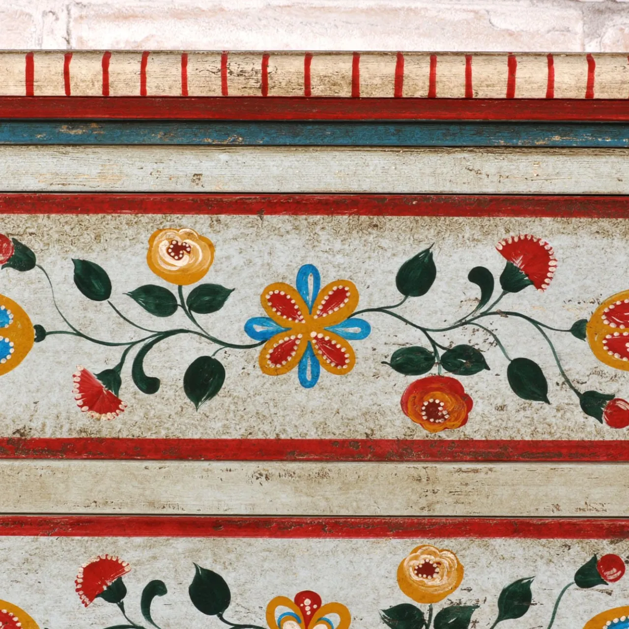 Graziosi piedi a cabriola sostengono la luminosa silhouette di questa cassettiera in legno, un superbo pezzo che celebra il mobile tirolese della fine del XVII secolo. Un trionfo di motivi floreali policromi adorna i sette cassetti, la cui tonalità emerge vividamente contro la superficie bianca patinata. Abilmente decorato seguendo antiche e segrete tecniche artigianali, può essere personalizzato su richiesta al Concierge.