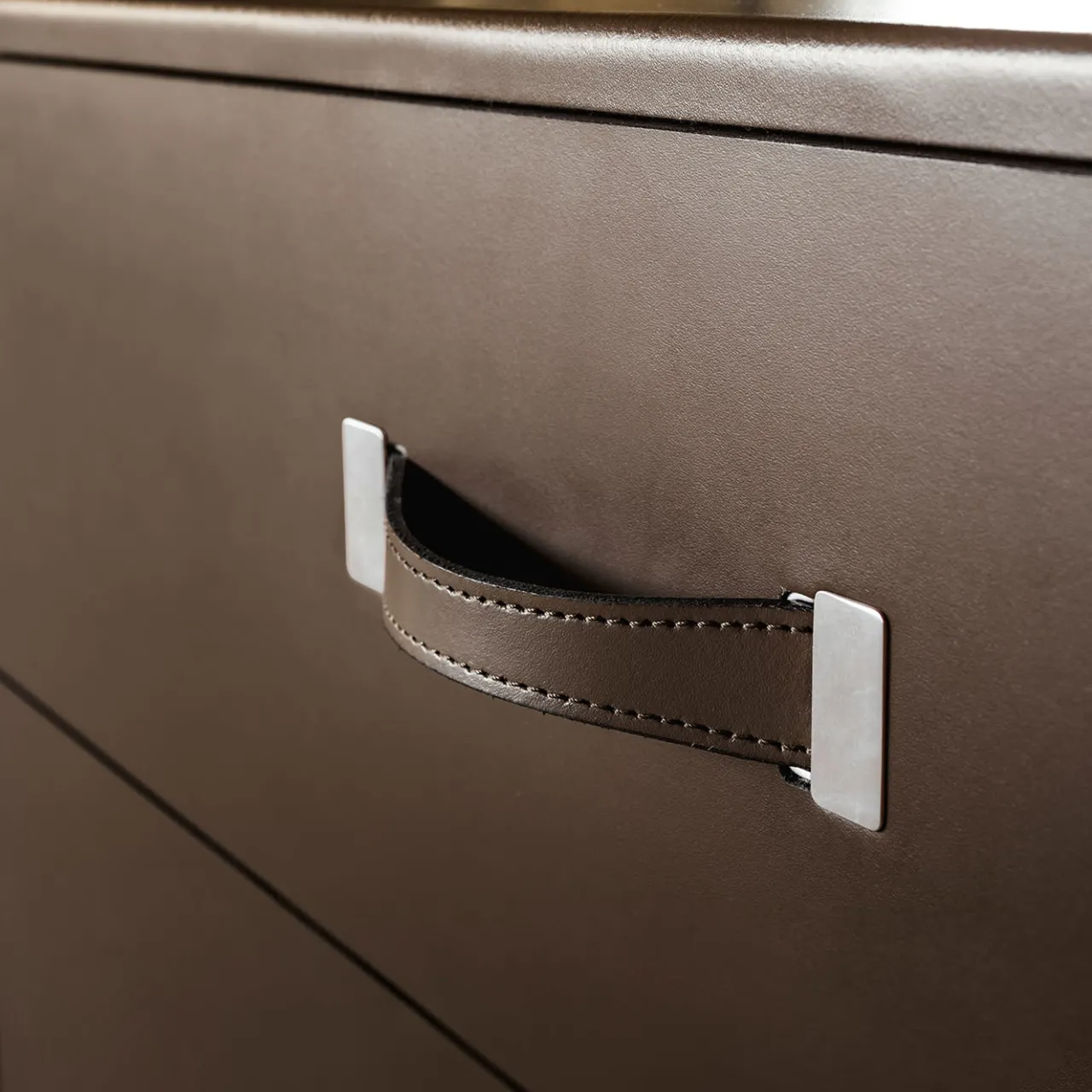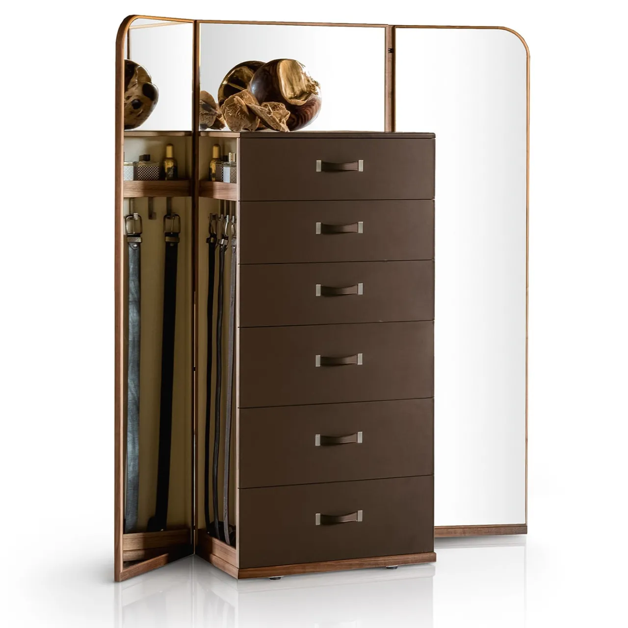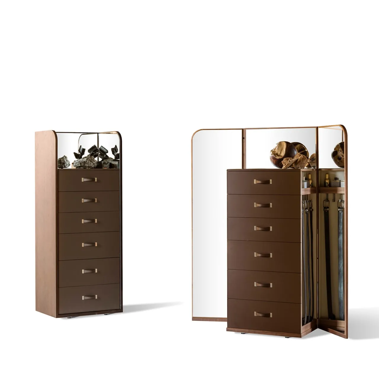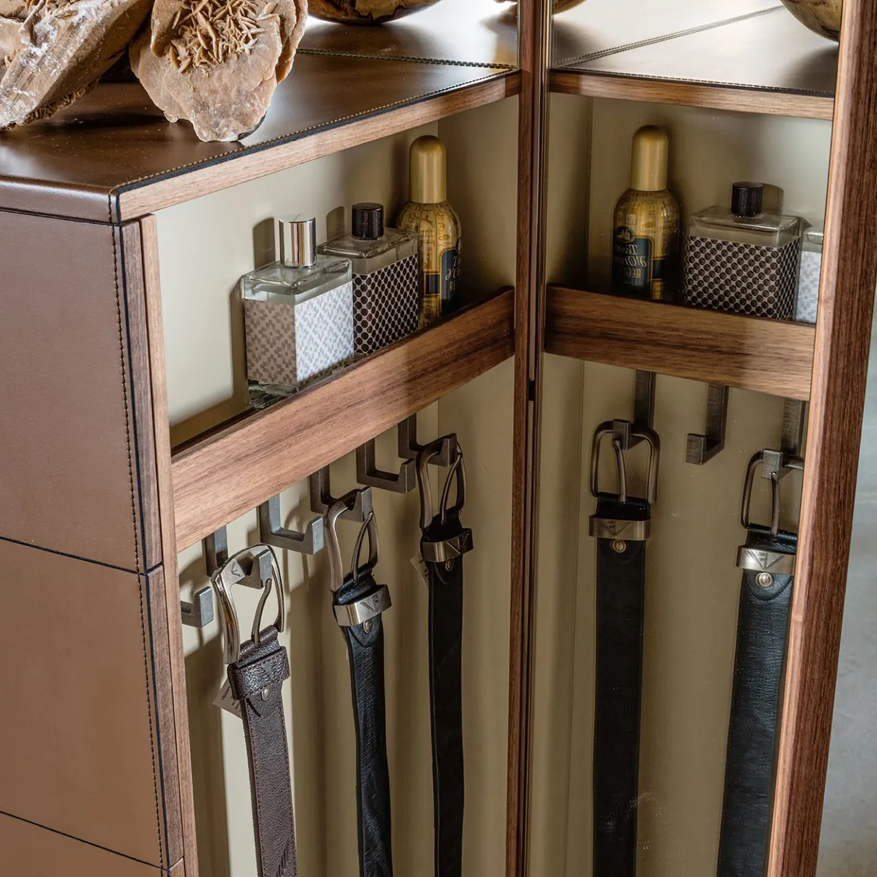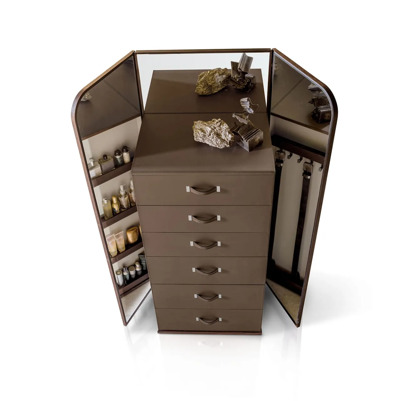 Una struttura elegante realizzata in rovere termotrattato e arricchita da cuoio color fango che aderisce al piano e ai cassetti e conferisce una lussuosa eleganza sartoriale a questa raffinata cassettiera. I vani portaoggetti aperti e i ganci per le cinture sui lati si rivelano una volta aperte le ante laterali, i cui inserti in vetro a specchio massimizzano la funzionalità e l’esclusività del design. Perfezionato con cuciture decorative, il pezzo può essere personalizzato nelle tonalita’ del rivestimento su richiesta al Concierge.