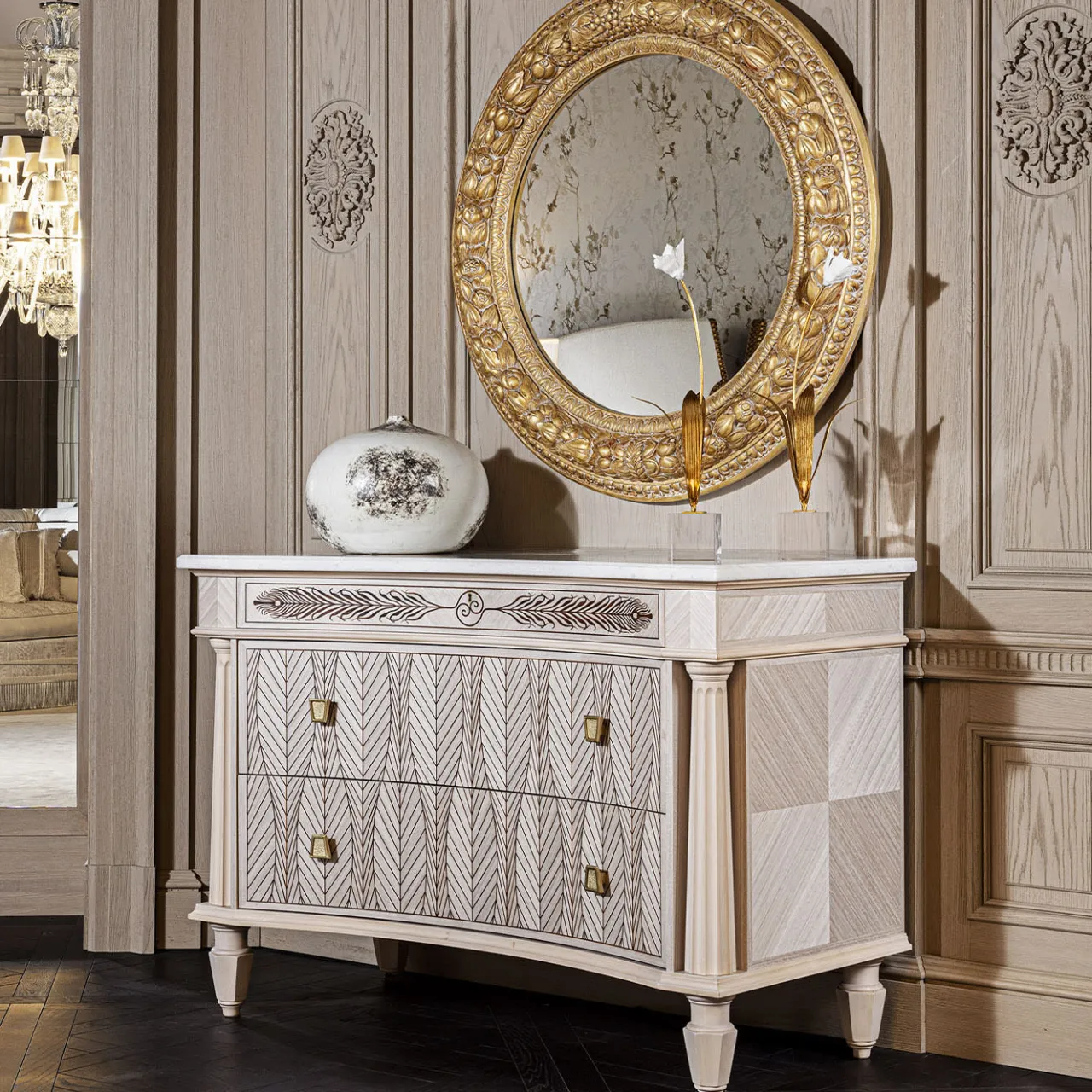 Questa cassettiera è realizzata a mano e presenta una raffinata struttura in eucalipto intarsiato ornata da un prezioso piano in marmo.