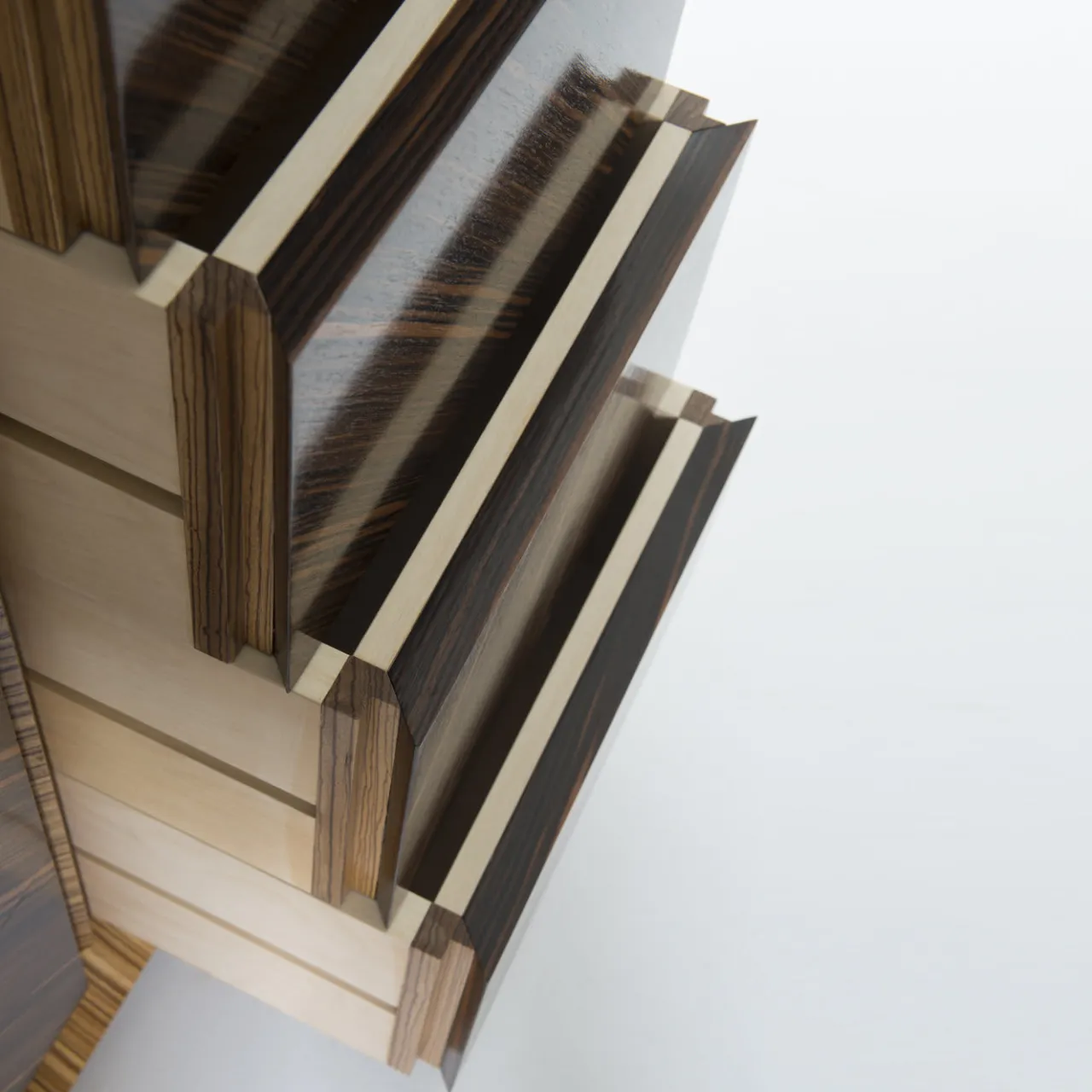 Questa cassettiera unica nel suo genere si farà notare se collocata in una camera da letto o in una cabina armadio. La struttura esterna è realizzata in legno massiccio con un sorprendente motivo zebrato. La parte anteriore e posteriore del pezzo è in legno di ebano macassar con un motivo di taglio a croce a 45 gradi, con otto cassetti frontali e un’ulteriore apertura laterale e centrale. Anche la base è in legno zebrato e la sottobase in ebano macassar. L’interno dei cassetti è in acero. Disegnato da Antonio Berdondini, anno 1944.