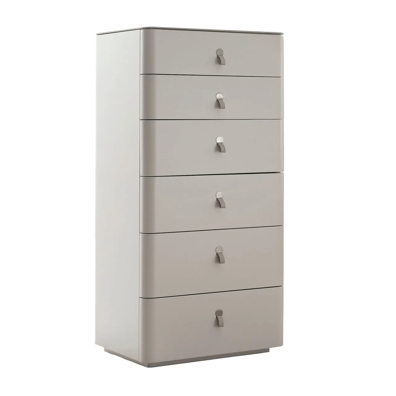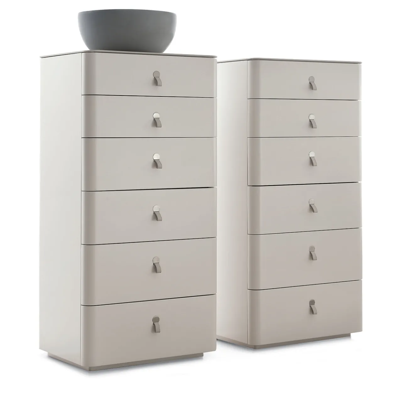 Progettato da Giuseppe Bavuso, questo comò vanta una struttura realizzata in rovere termotrattato o MDF laccato opaco, disponibile in vari colori. Il piano è elegantemente realizzato in pietra acrilica e ricoperto in pelle. I cassetti scorrono senza sforzo su guide metalliche, con frontali che si abbinano perfettamente alla struttura. Le maniglie in pelle con inserti metallici aggiungono un tocco di sofisticatezza. Questo pezzo presenta una finitura in MDF laccato opaco color crema con un piano in pelle abbinato.