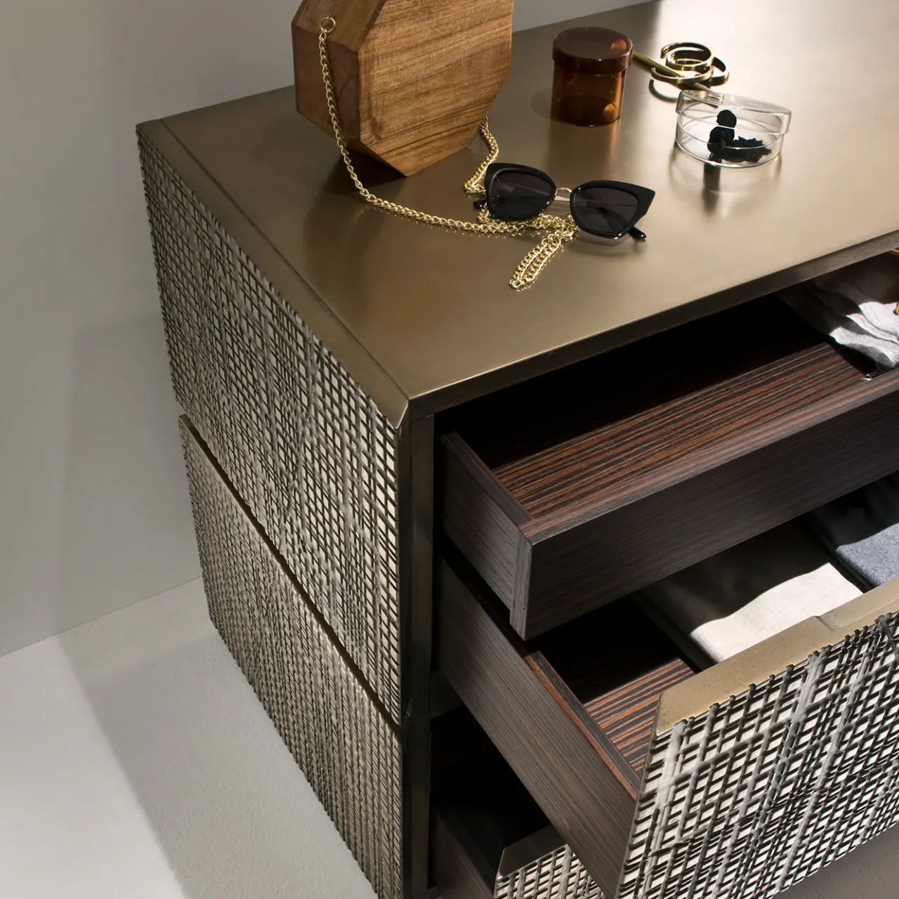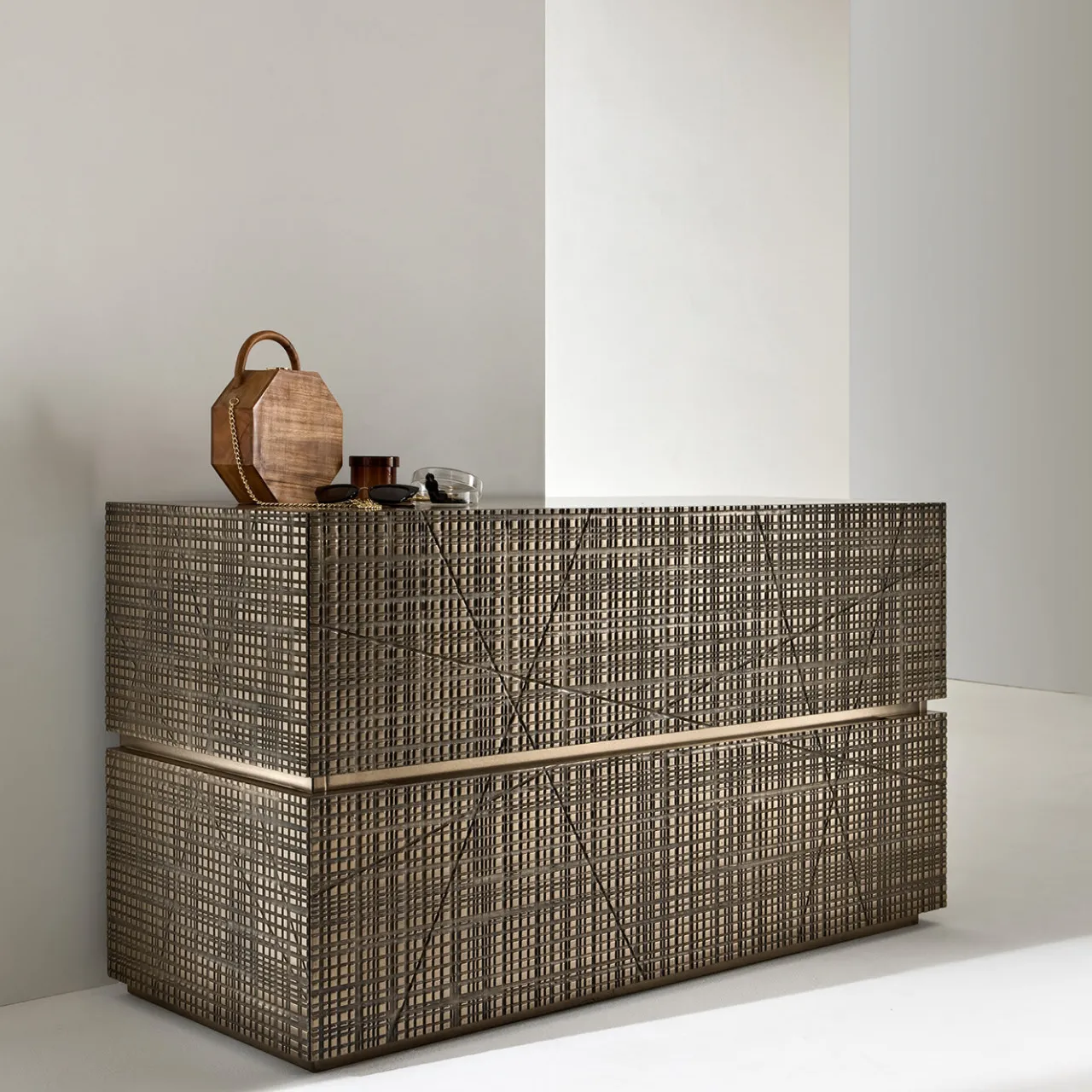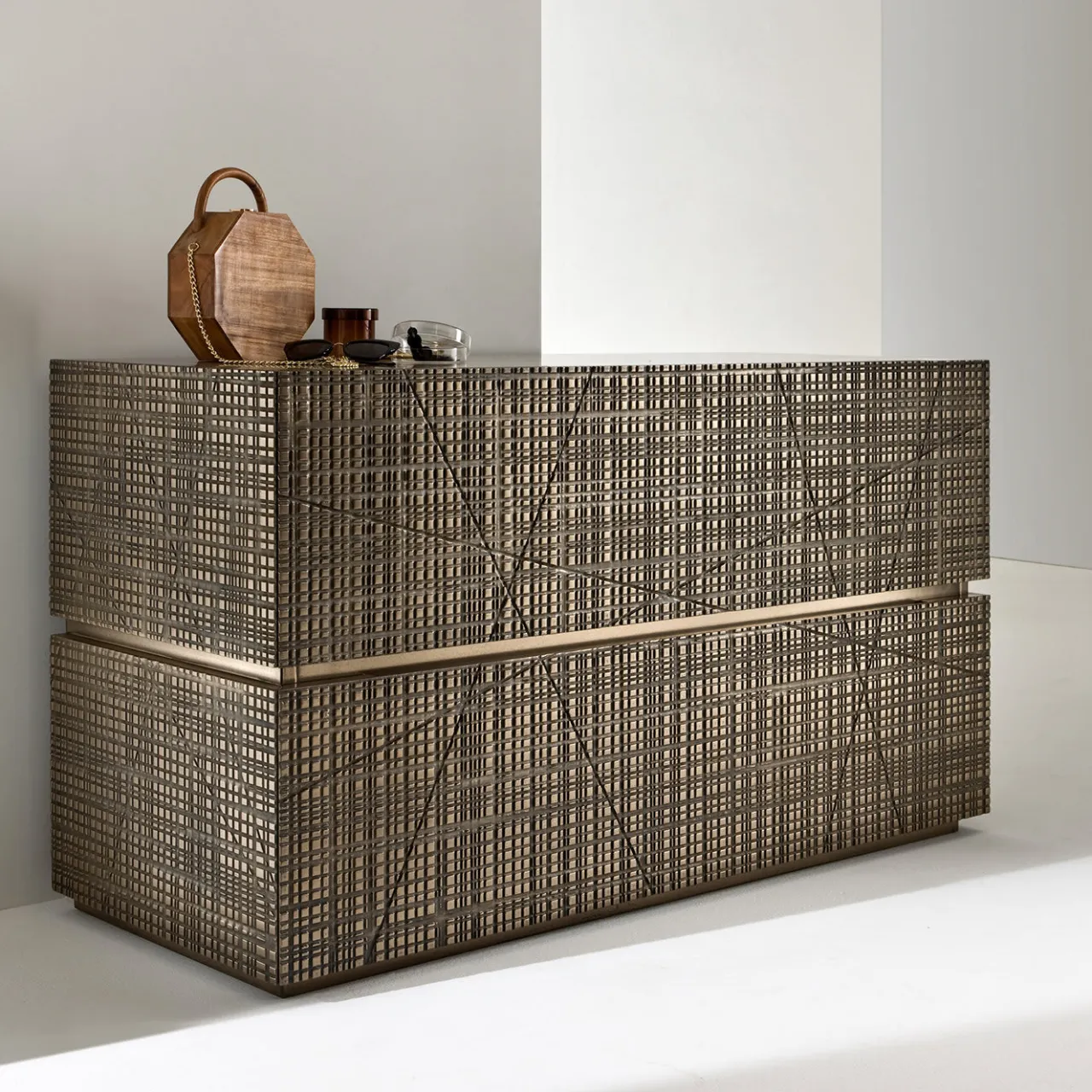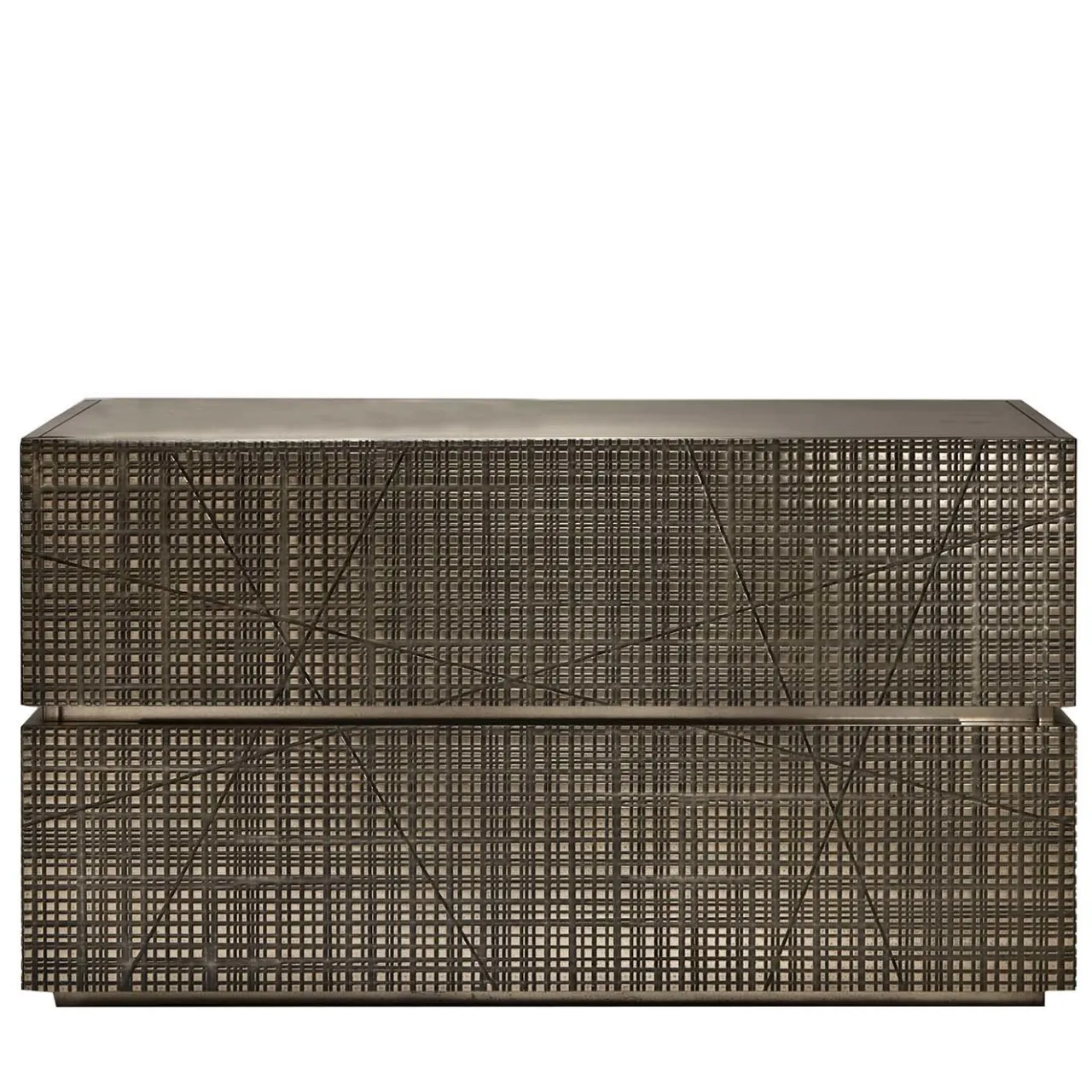 Parte della Collezione Maxima, questa splendida cassettiera è un superbo oggetto d’arredo funzionale. L’elemento distintivo di questo pezzo è il frontale intagliato, caratterizzato da una serie di tagli astratti con finitura Liquid Metal in bronzo chiaro. La struttura metallica presenta due cassetti esterni e due interni. Questo pezzo unico si abbina al meglio con altri della stessa serie ed è disponibile anche in diverse misure. Questo pezzo, che emana raffinatezza ed eleganza senza tempo, è adatto sia alla camera da letto che al soggiorno.