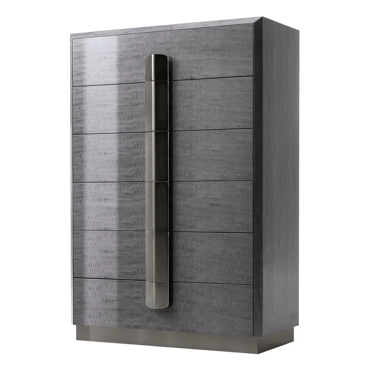 Cassettone in impiallacciato di Mowinghi figurato del Madagascar con finitura poliestere lucida. Piano e fianchi in marmo nero del Kenya. Base e maniglie in acciaio inox satinato nichel nero. 6 cassetti ad estrazione totale con parte inferiore in tessuto vellutato.