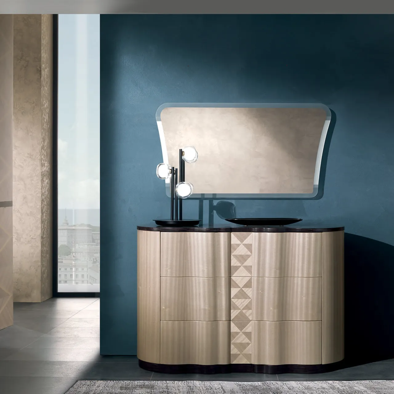 Caratterizzato da linee morbide e sinuose, il comò Mistral è realizzato in legno di Pama con piano in Sicomoro in finitura frisé scuro. Un pezzo accattivante grazie alla sua forma insolita, i cassetti sono completati da un motivo geometrico a intarsio. Cassetti a pressione con chiusura ammortizzata. Disponibile anche il comodino complementare.