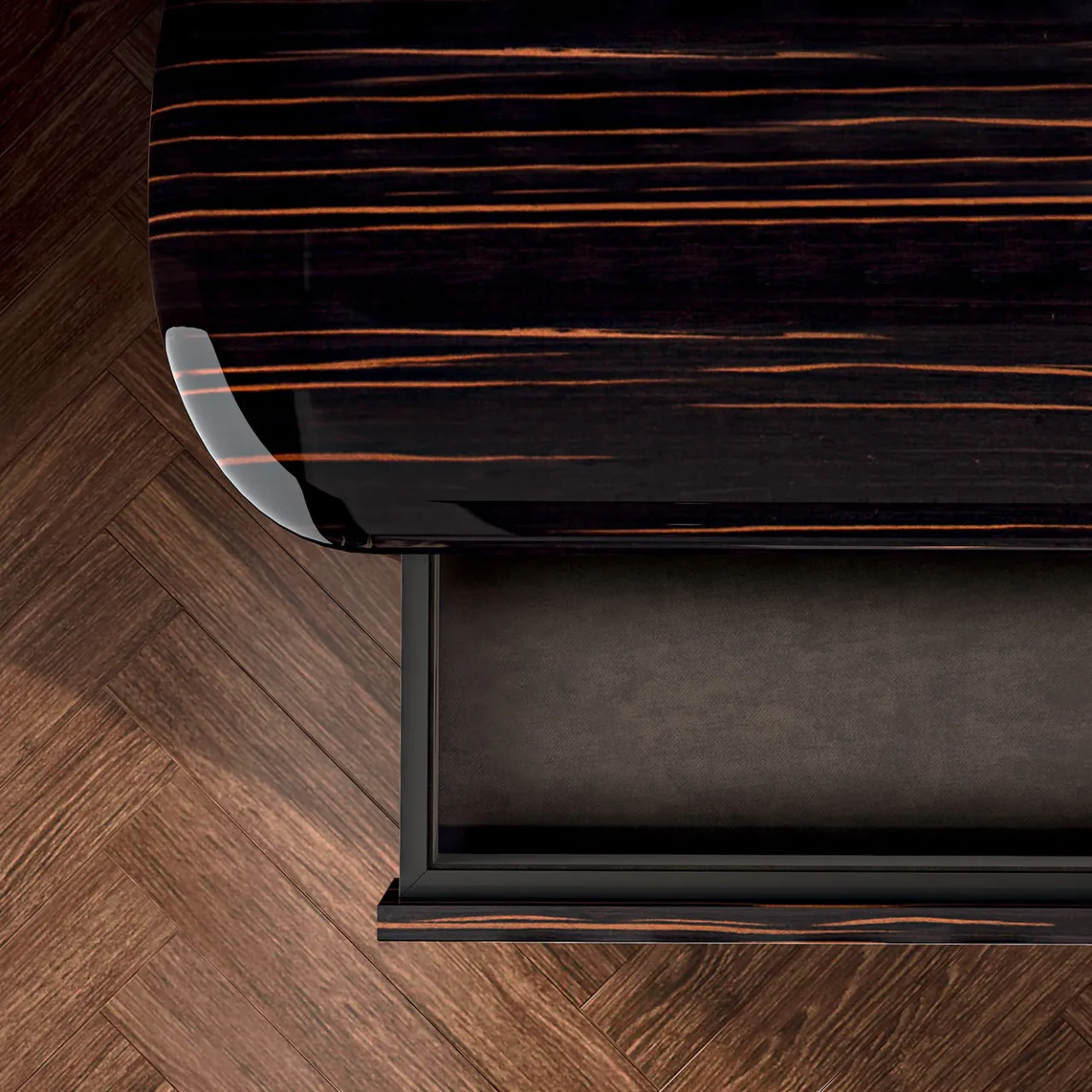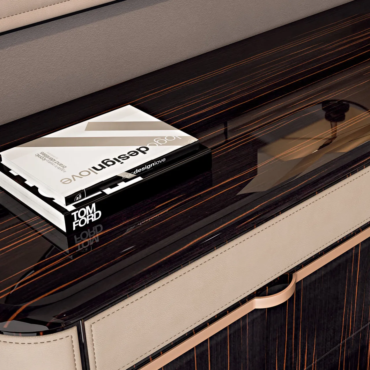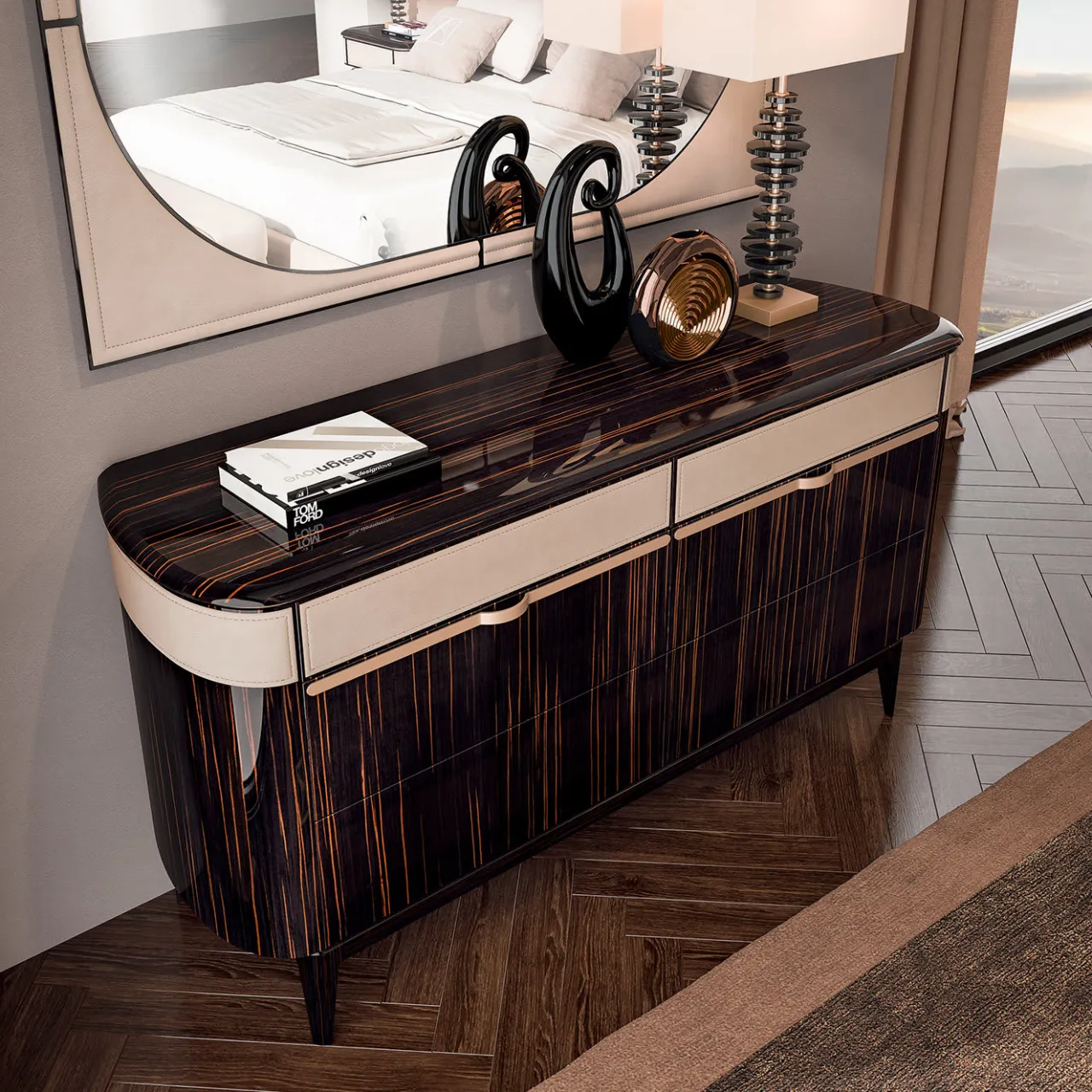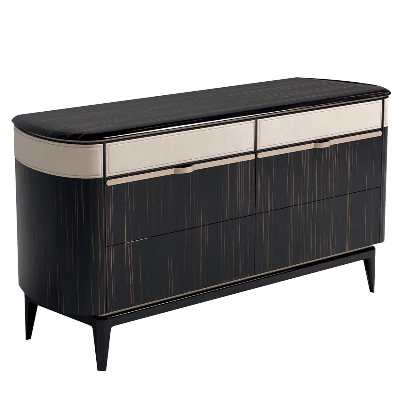 Questo cassettone a sei cassetti dal gusto rétro è una variante del cassettone a 3 cassetti Louis e del cassettone a 6 cassetti Marcel. La sua struttura in legno ha una splendida impiallacciatura in ebano che mette in risalto le sue curve delicate ed è impreziosita da inserti in metallo con finitura oro rosa. L’elemento distintivo di questo pezzo è il piano superiore dei cassetti e i loro lati, rivestiti con un’elegante pelle beige. Il legno può avere altre impiallacciature e il piano può essere anche in marmo. Sono disponibili altre finiture per il metallo e il rivestimento può essere anche in tessuto. Si prega di chiedere al Concierge.