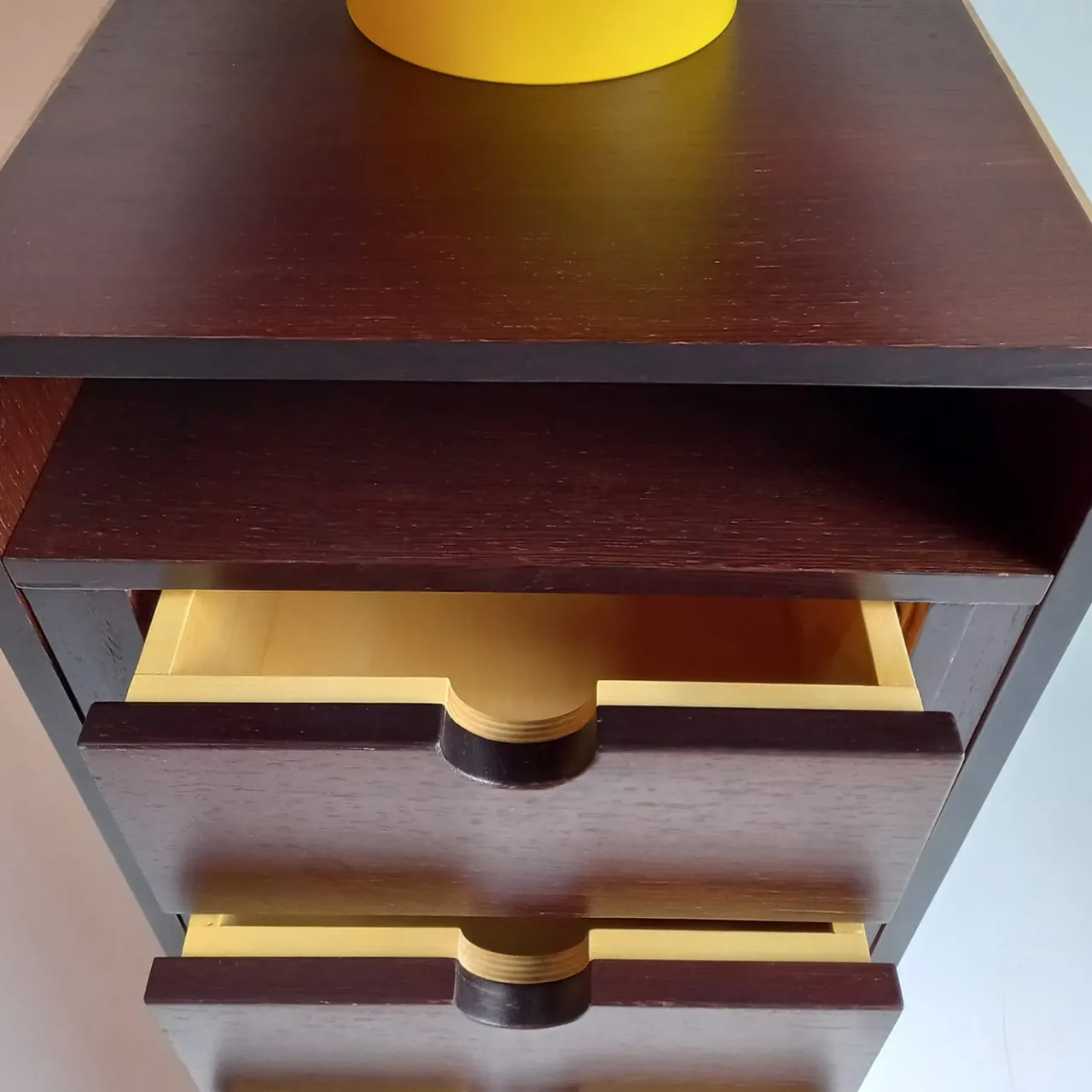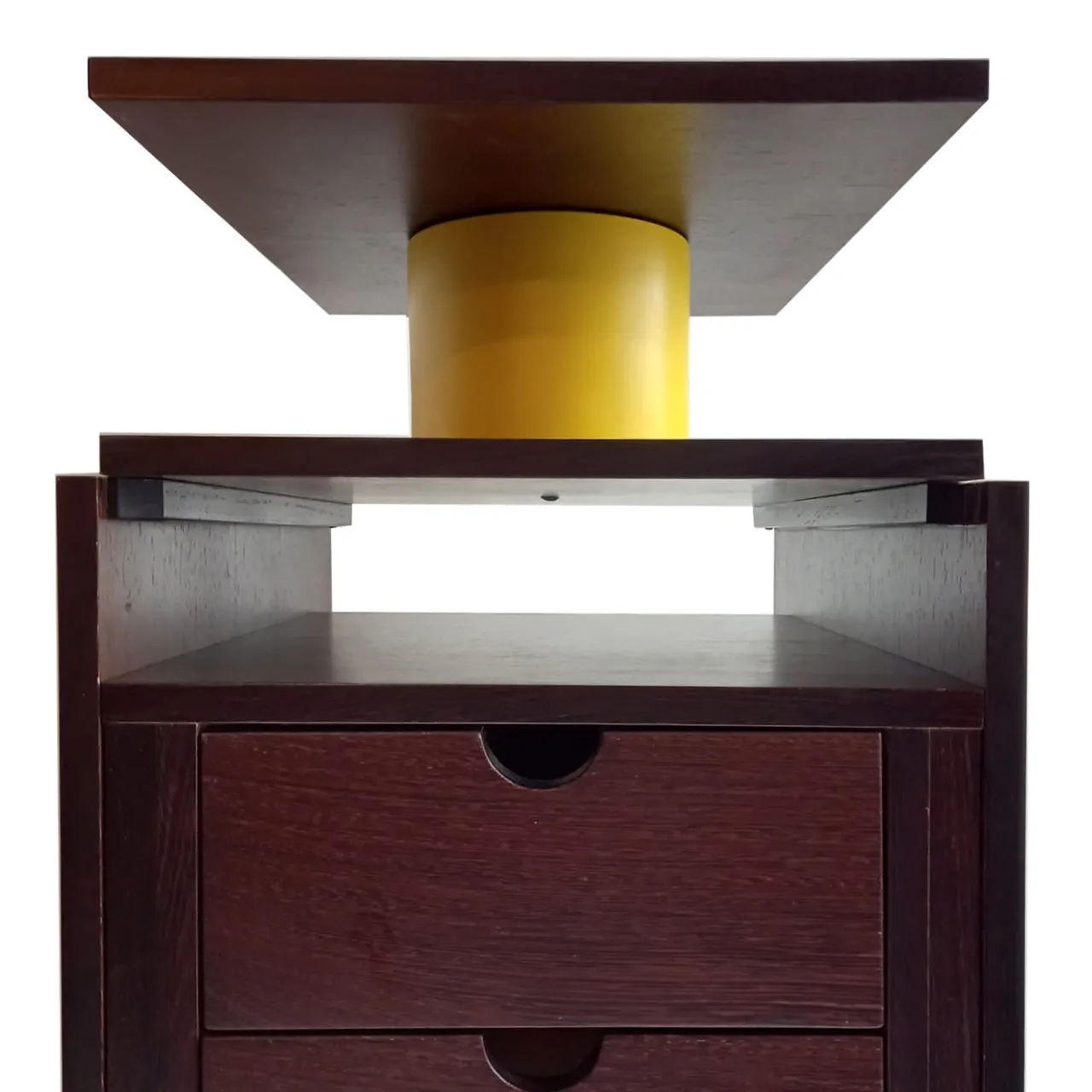 Parte di un’edizione limitata a soli dieci pezzi numerati e firmati, questa cassettiera è una celebrazione di volumi rigorosi e contrasti vibranti. La struttura cuneiforme vanta inserti in radica di frassino, i cui conflitti di finitura sono ulteriormente ravvivati dal cilindro in terracotta laccata gialla che sostiene un originale piano girevole.