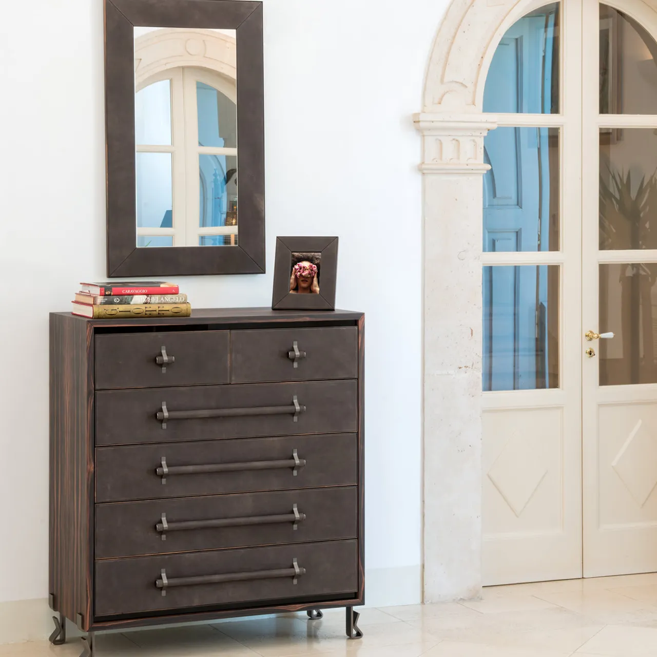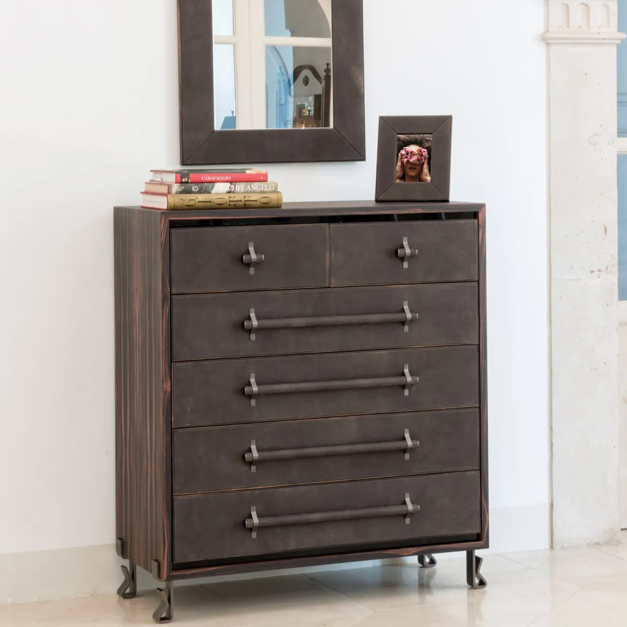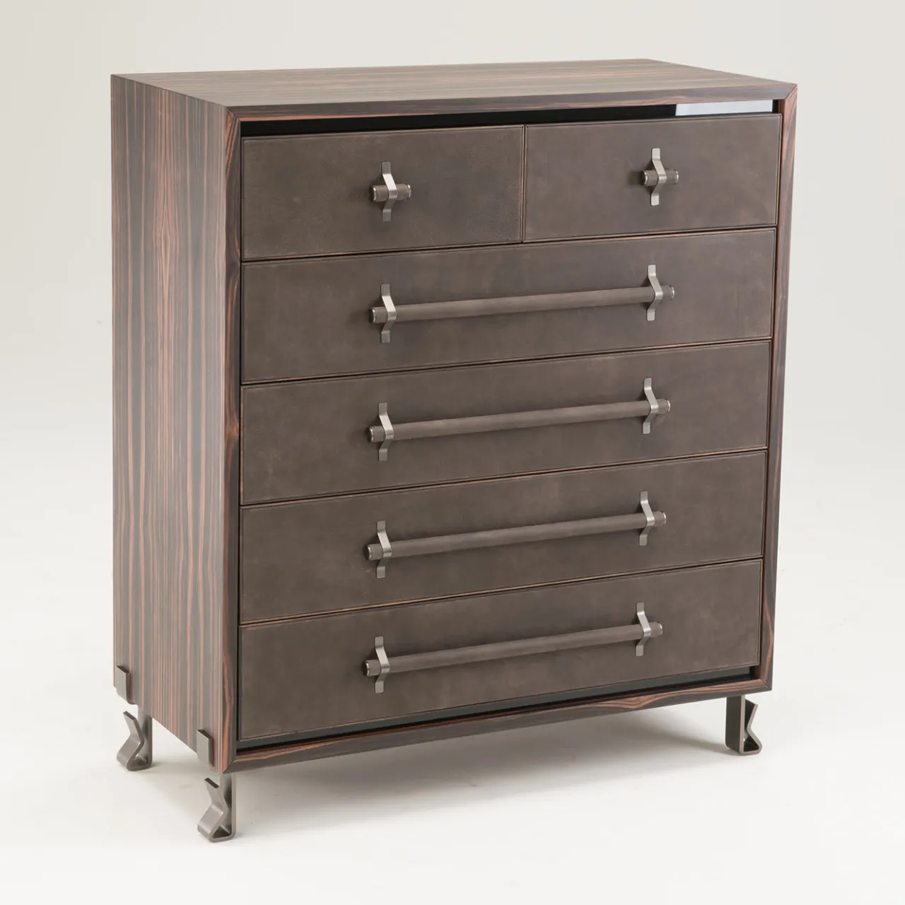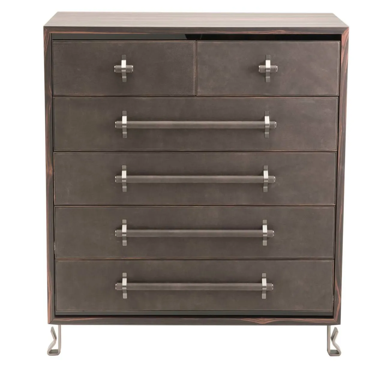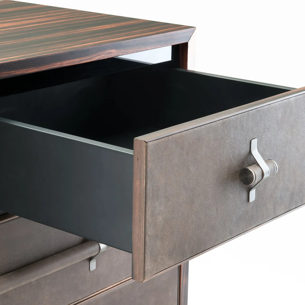 Questa cassettiera è realizzata in legno di ebano originario del Madagascar. Presenta cassetti laccati grigio opaco, il cui frontale è rivestito in vera pelle con finiture in ebano. L’articolo comprende anche inserti in parapan nero e maniglie in acciaio inox rivestite in vera pelle marrone scuro, oltre a piedi e attrezzature in acciaio satinato brunito.