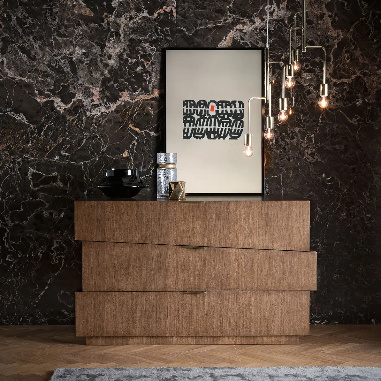 Questa credenza è un pezzo unico dall’allure contemporanea, con un gioco di forme irregolari che rivela un sorprendente effetto scultoreo. La credenza è composta da tre cassetti con chiusura ammortizzata in legno di rovere arricchiti da maniglie in metallo con finitura in ottone brunito.