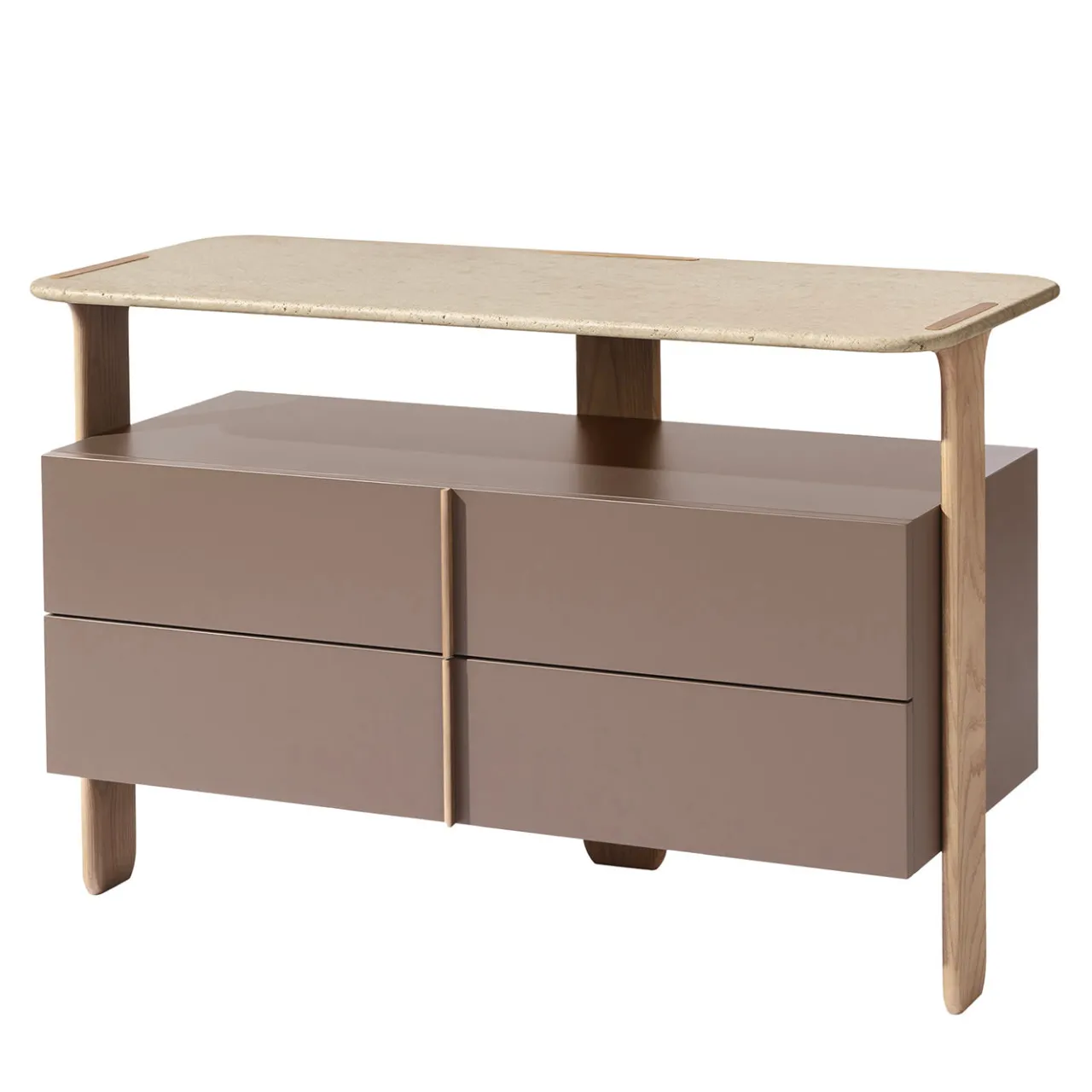 Lo splendido mix di legno di frassino e marmo è perfetto per un ambiente contemporaneo e moderno. Complementare al comodino Trio, questa splendida cassettiera è un pezzo iconico per ogni camera da letto. La struttura è dotata di due cassetti con chiusura ammortizzata. I dettagli in legno delle maniglie e il piano in marmo danno un ulteriore tocco di design. Finitura Fango e Ardesia. Il piano in marmo è il Marmo Travertino Oniciato. Sono disponibili altre finiture e marmi.