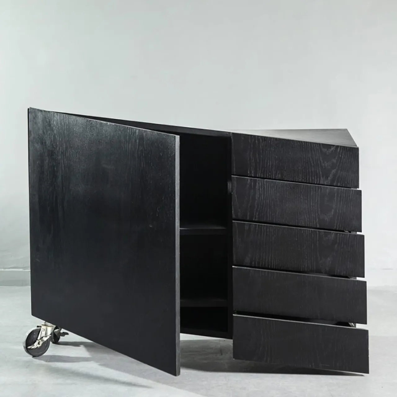 Il pezzo presenta una struttura realizzata in rovere laccato nero opaco a poro aperto, che mette in evidenza le venature naturali del legno. Impreziosito da ruote in stile industriale, unisce l’eleganza moderna a un design funzionale e tagliente. Perfetto per aggiungere carattere e versatilità agli interni contemporanei.