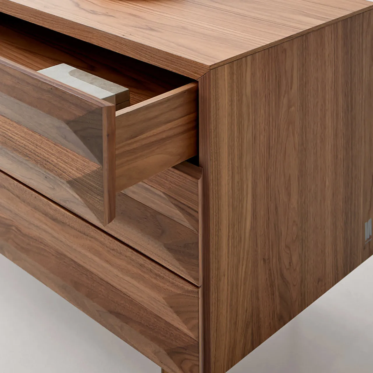 Una cassettiera a 3 cassetti con frontale sfaccettato in legno massiccio con finitura retrò, adatta anche al centro della stanza. Verniciatura ecologica all’acqua. legno. I piedi sono cilindrici in metallo color bronzo e terminano con una punta in legno. Finitura Canaletto Avana e piedi in metallo color bronzo.