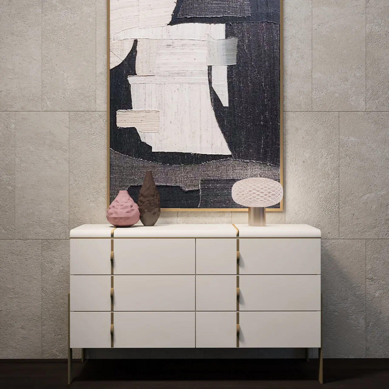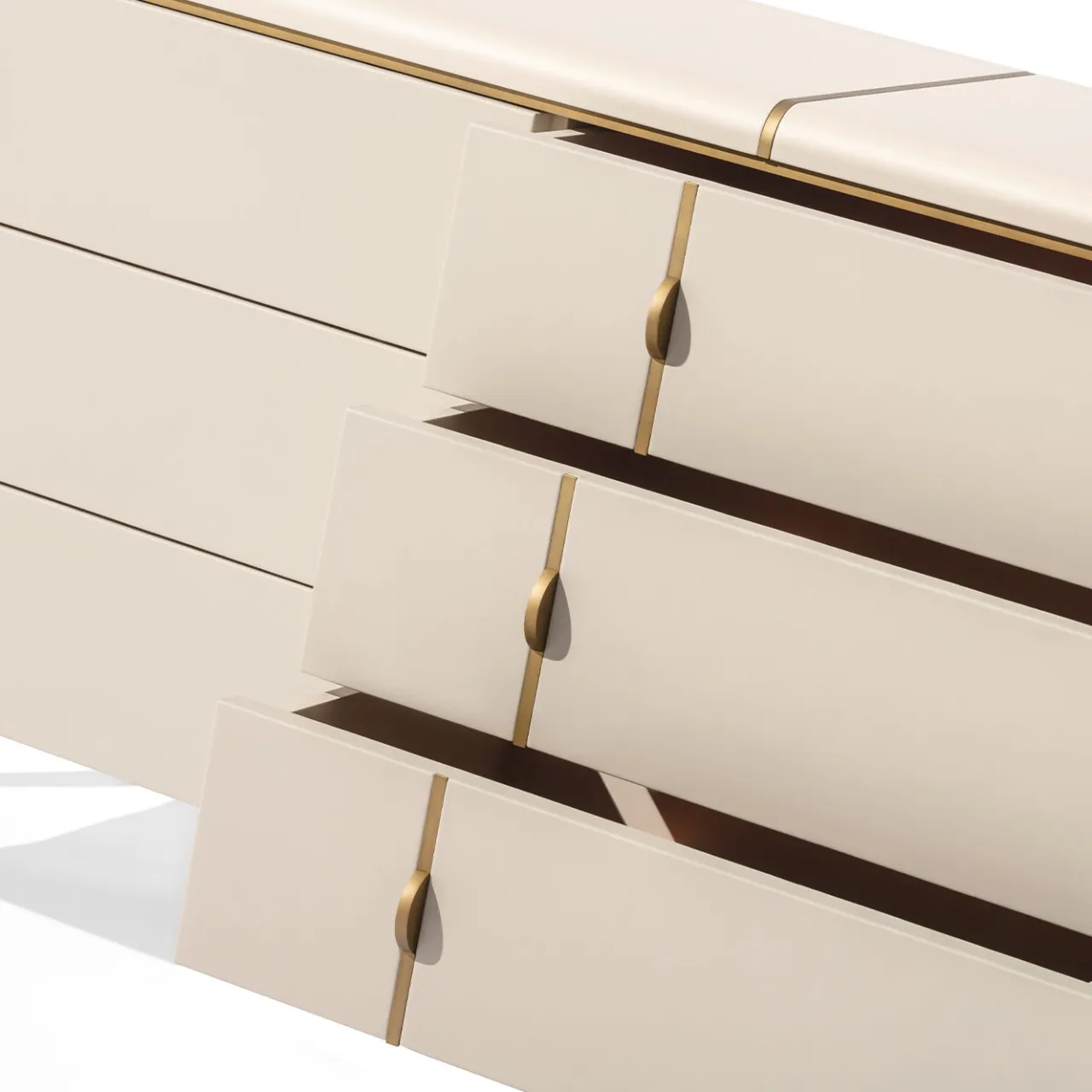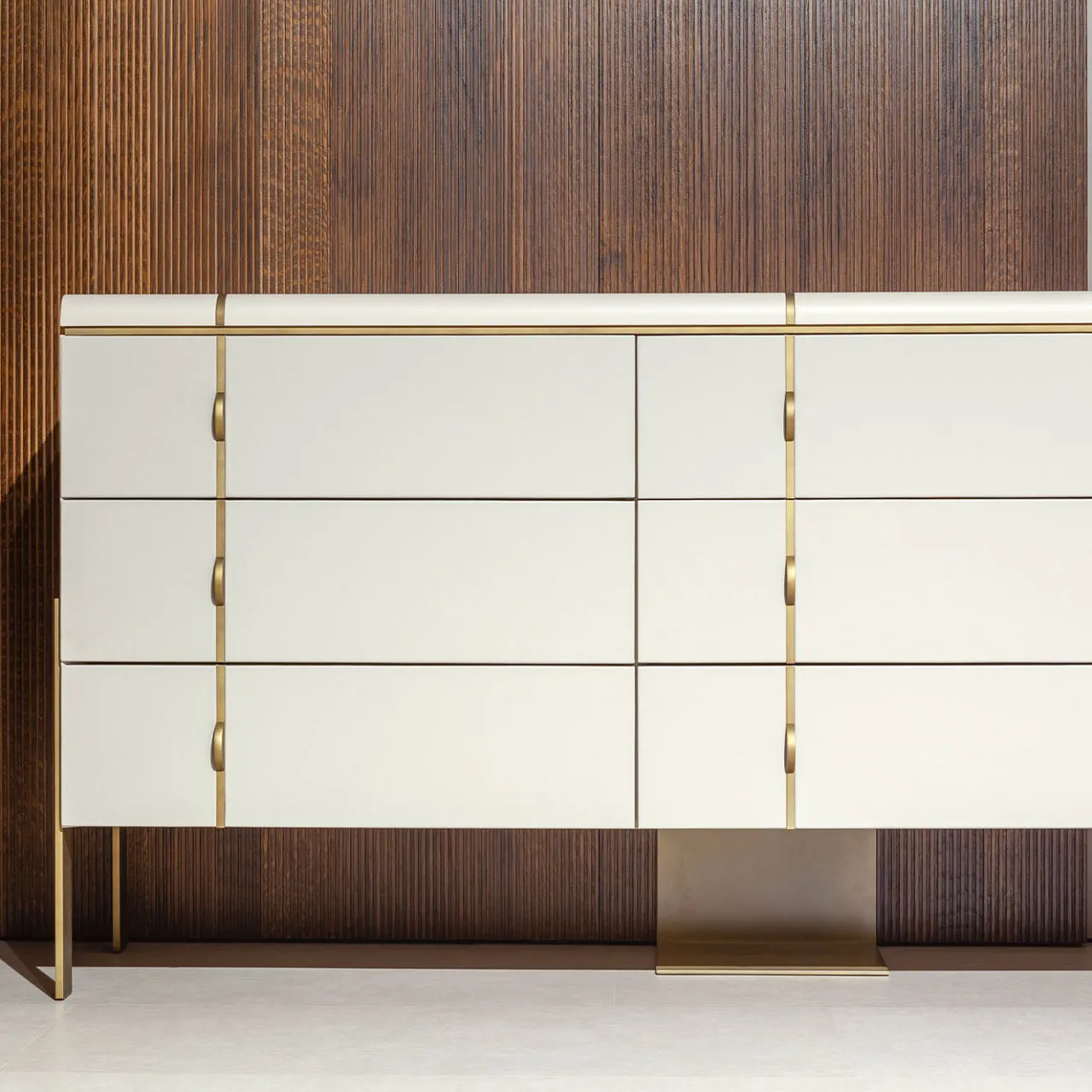 Complementare al Comodino Althea e al Vanity Table, questo splendido comò impreziosisce in modo unico una camera da letto contemporanea di lusso. Laccato bianco e impreziosito da inserti in metallo, la struttura è dotata di sei cassetti e poggia su eleganti gambe in metallo a barra piatta. Personalizzabile, contattare il Concierge per ulteriori dettagli e opzioni.