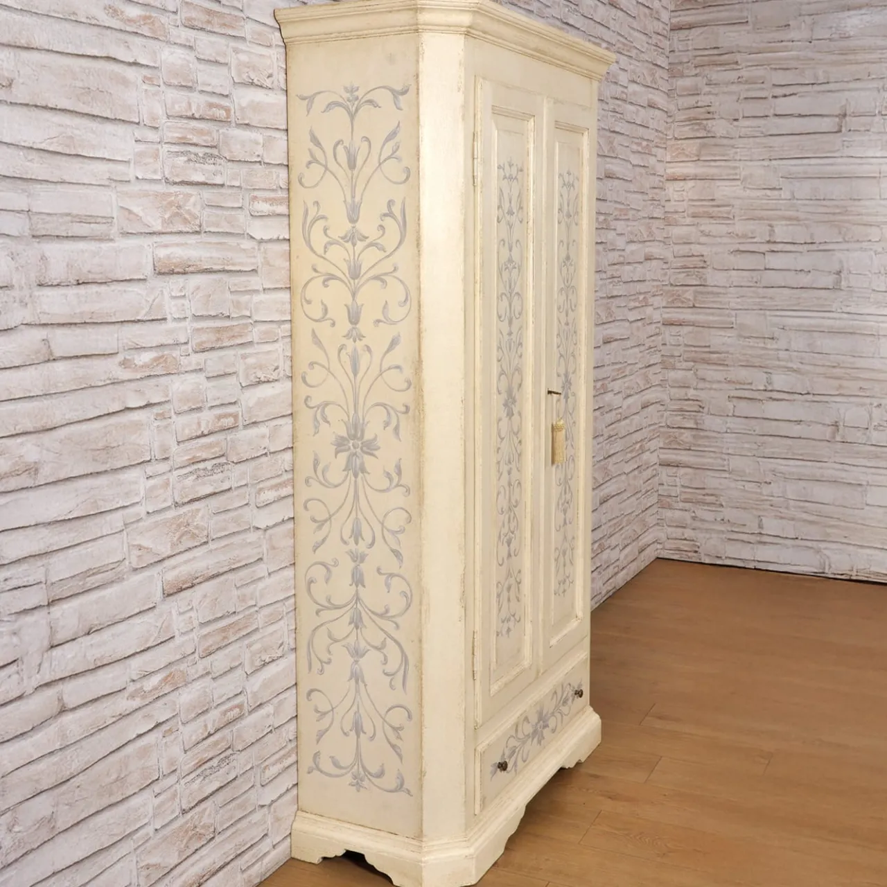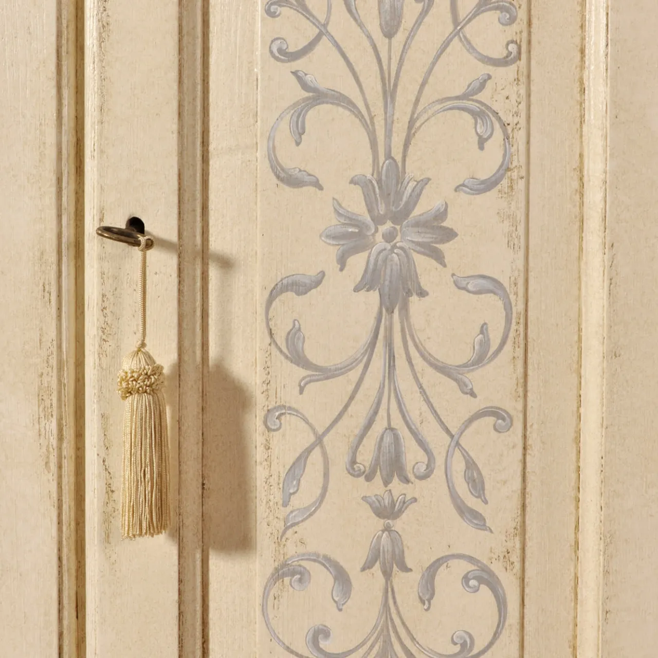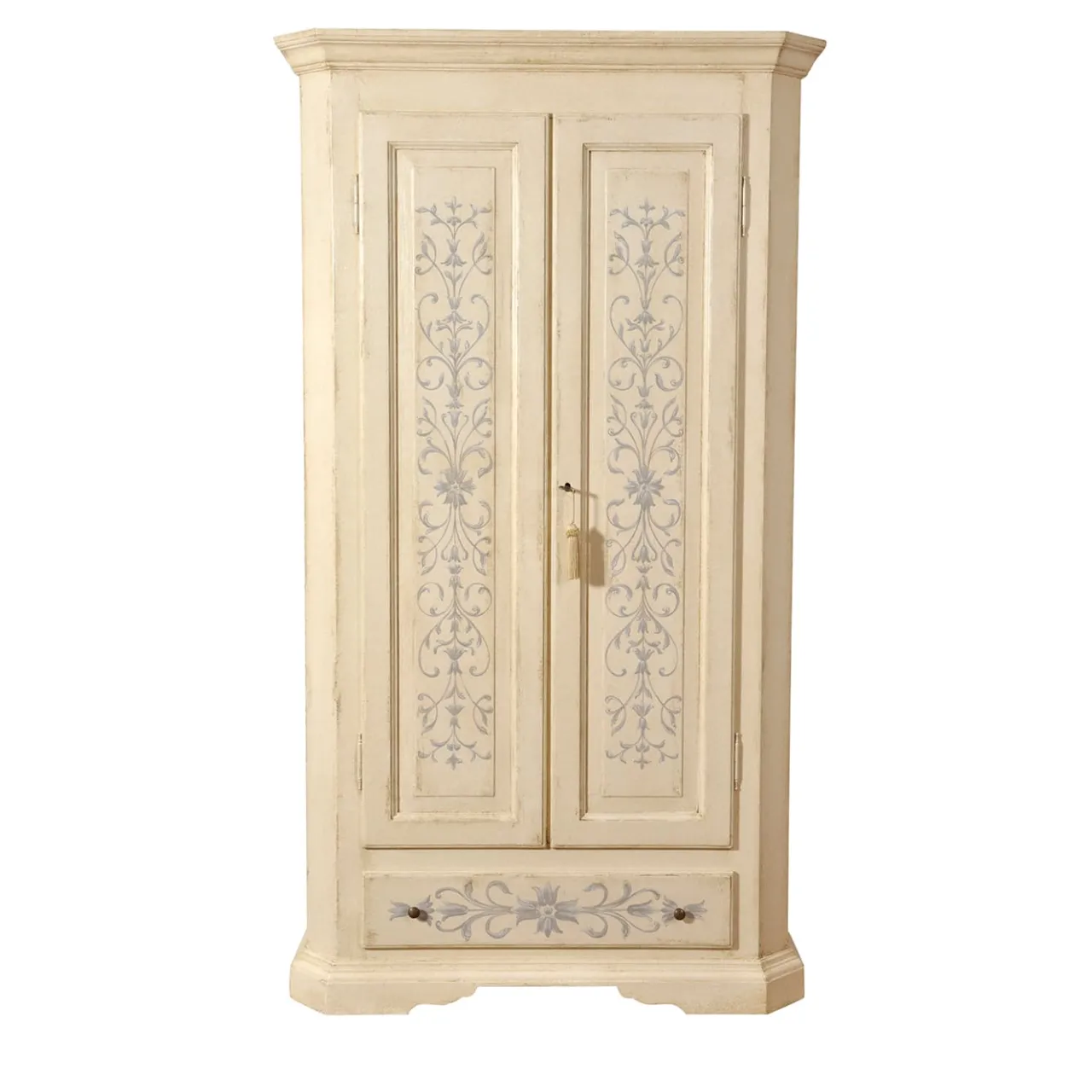 Questo comò presenta due ante e un cassetto, realizzato con linee raffinate che richiamano lo stile tirolese italiano. Il comò è laccato in un caldo beige ed è dipinto a mano con intricate motivazioni barocche e floreali in una tonalità di blu tenue. Le opzioni personalizzabili includono dimensioni, colori e motivi decorativi. Contatta il Concierge per ulteriori dettagli.