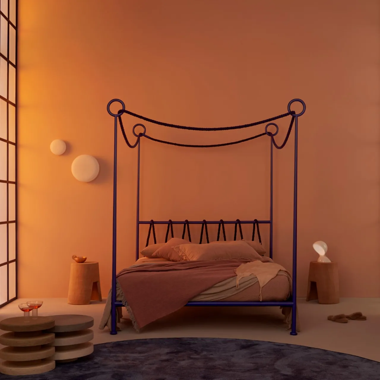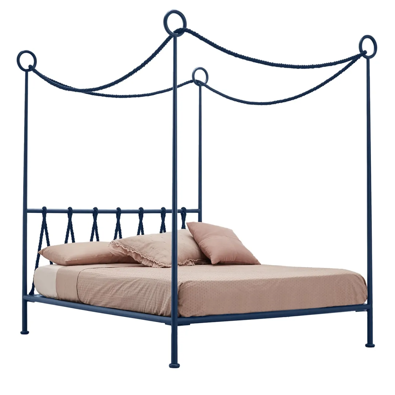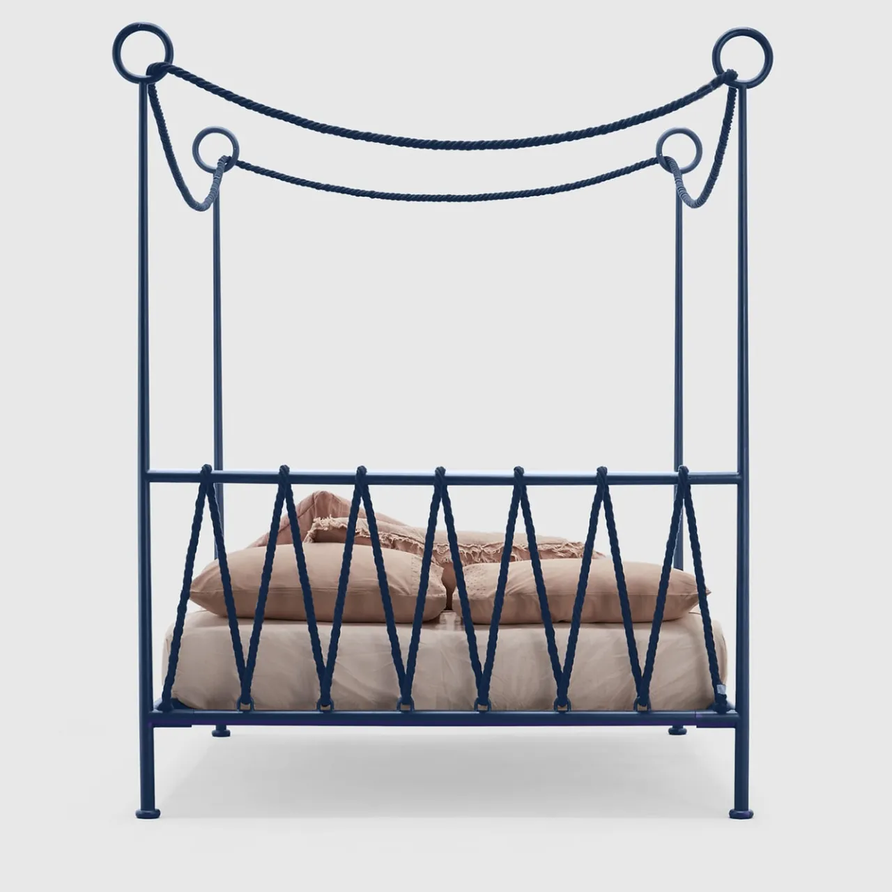 Un’abile reinvenzione contemporanea dei letti come erano nell’Antica Roma, questo letto matrimoniale a baldacchino si distingue immediatamente per la sua inconfondibile ispirazione nautica. La struttura a baldacchino in ferro è verniciata due volte e presenta inserti in corda in tinta che passano attraverso le estremità ad anello del baldacchino e danno forma alla testata. Si prega di esplorare le opzioni di personalizzazione con il Concierge.