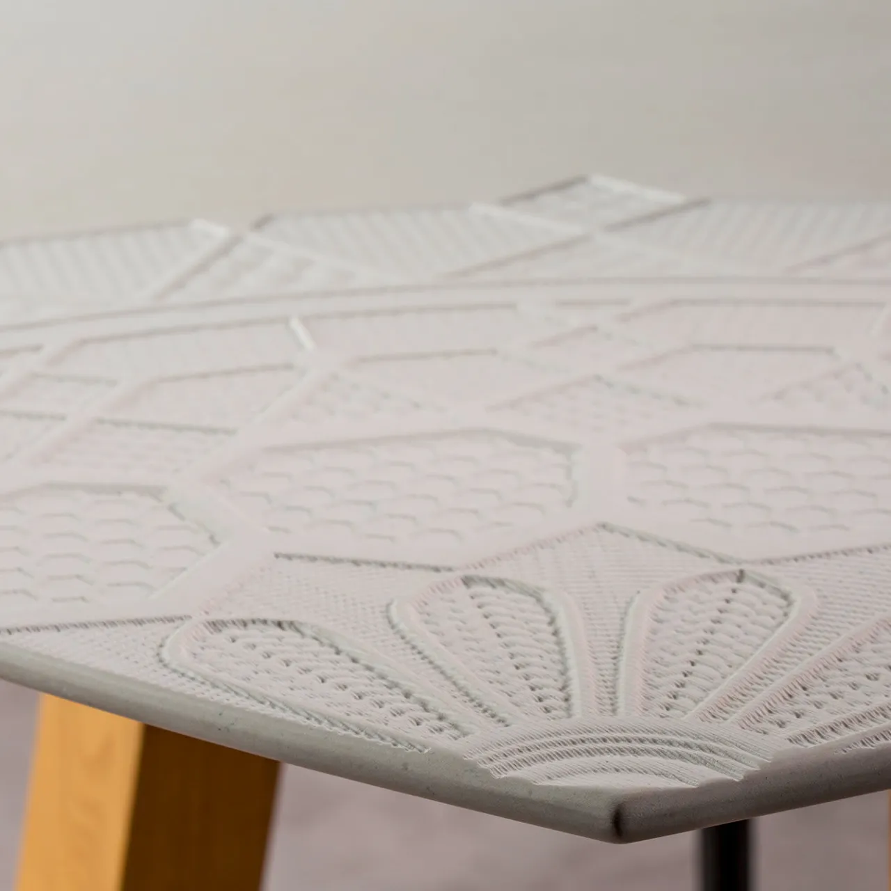 Questo tavolo da pranzo moderno e di grande impatto è realizzato in pietra Crema Tunisi. Il piano presenta una superficie squisitamente scolpita, che mette in mostra superbi centrini e rivestimenti. La struttura lineare ed elegante della base è realizzata in legno con finitura naturale. Questo sofisticato tavolo può essere personalizzato utilizzando per il piano il marmo Bianco Fenice, il marmo bianco di Carrara, la pietra Bardiglio Imperiale e la pietra Pece.
