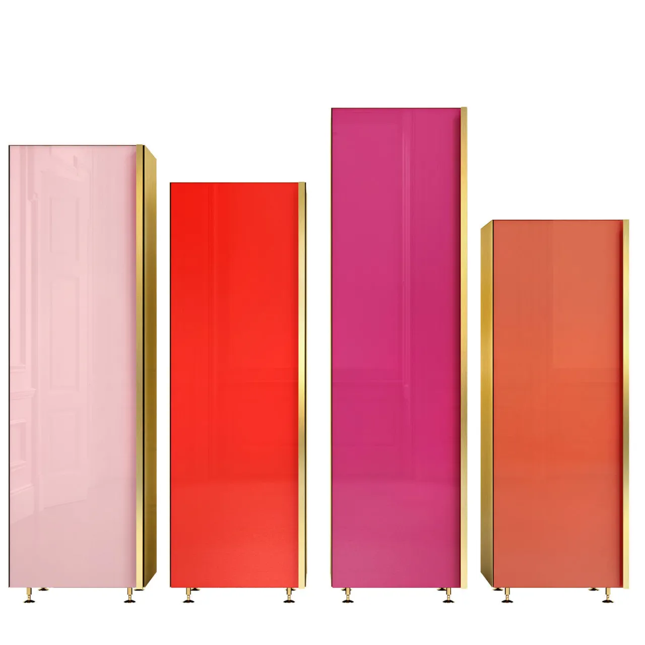 Questo set è composto da quattro armadi che misurano ciascuno 55 cm di larghezza, 45 cm di profondità e rispettivamente 185, 170, 200 e 155 cm di altezza, come da immagine. Il design è caratterizzato da una struttura in legno con pannelli in ottone lucido, lo stesso materiale utilizzato per realizzare la maniglia verticale a grandezza naturale e i piedini. Le ante in vetro che chiudono gli armadi sono retroverniciate con colori vivaci, dal rosa chiaro al rosso acceso. Ciascuna credenza può essere venduta separatamente. Chiedere al concierge per preventivi e opzioni di personalizzazione.