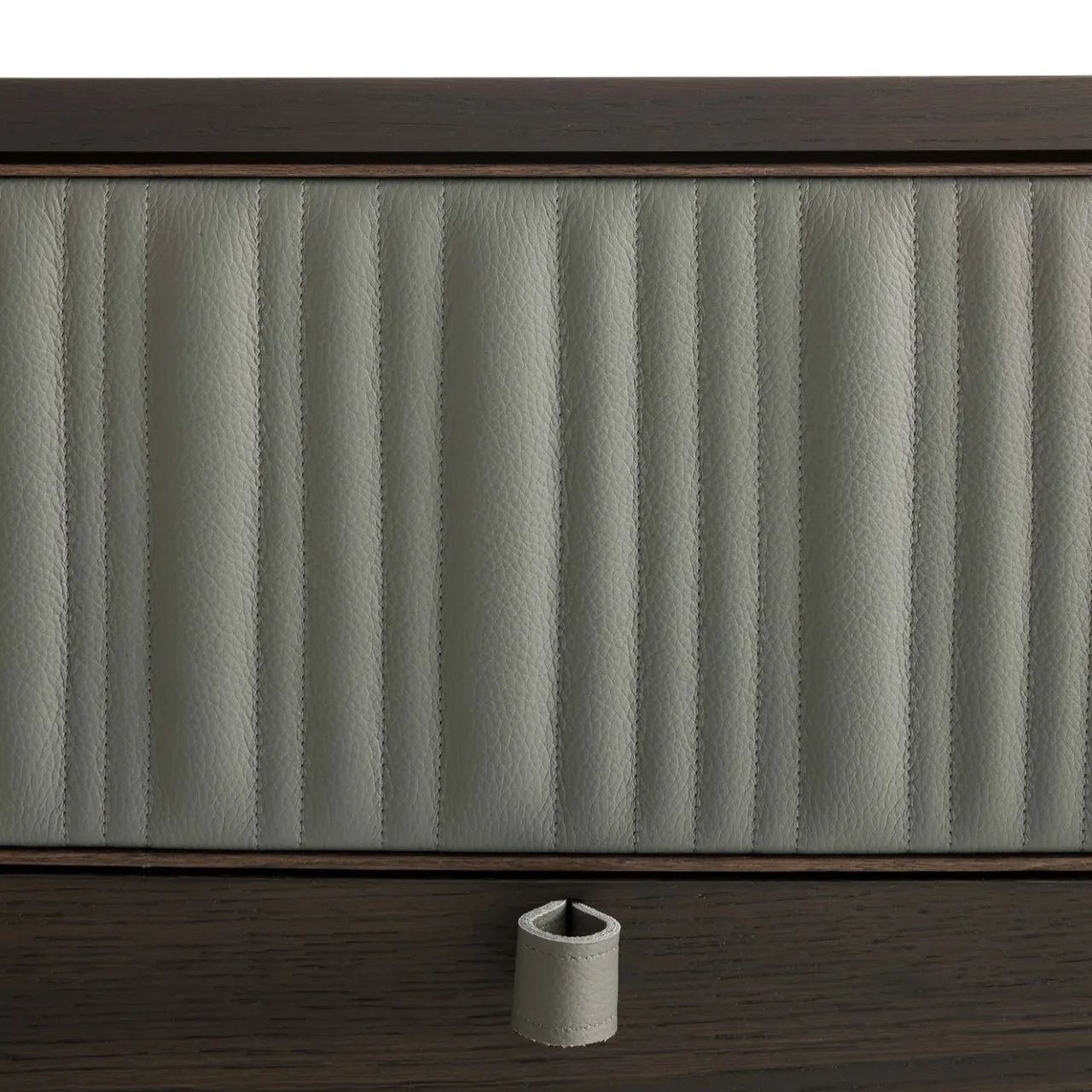 Preziosi dettagli sartoriali ispirano il design raffinato di questo comò, un pezzo esclusivo per massimizzare lo spazio contenitivo e aggiungere profondità cromatica alla camera da letto. La base in metallo brunito verniciato a polvere sostiene una generosa struttura in legno impiallacciato in rovere Laguna profondo, composta da tre cassetti, il più alto dei quali sfoggia una speciale texture canalizzata rivestita in pregiata pelle grigia.