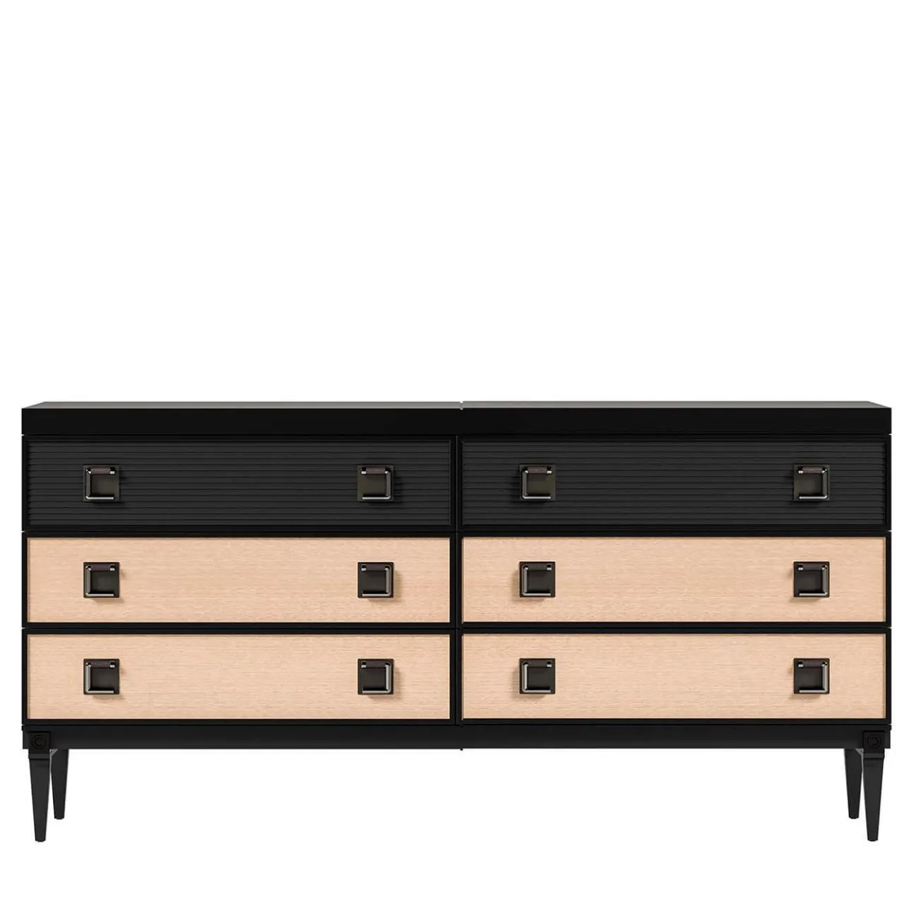 Maestoso e versatile, questo comò a sei cassetti unisce funzionalità e fascino artistico. La struttura rettangolare è realizzata in impiallacciatura di eucalipto con finitura laccata nera e pannelli beige sui fianchi e solo sui quattro cassetti inferiori (i cassetti superiori hanno un pannello frontale nero a coste). Il piano in metallo laccato nero e i pomelli con il logo dell’azienda completano questo pezzo elegante che si farà notare in una casa dallo stile contemporaneo.