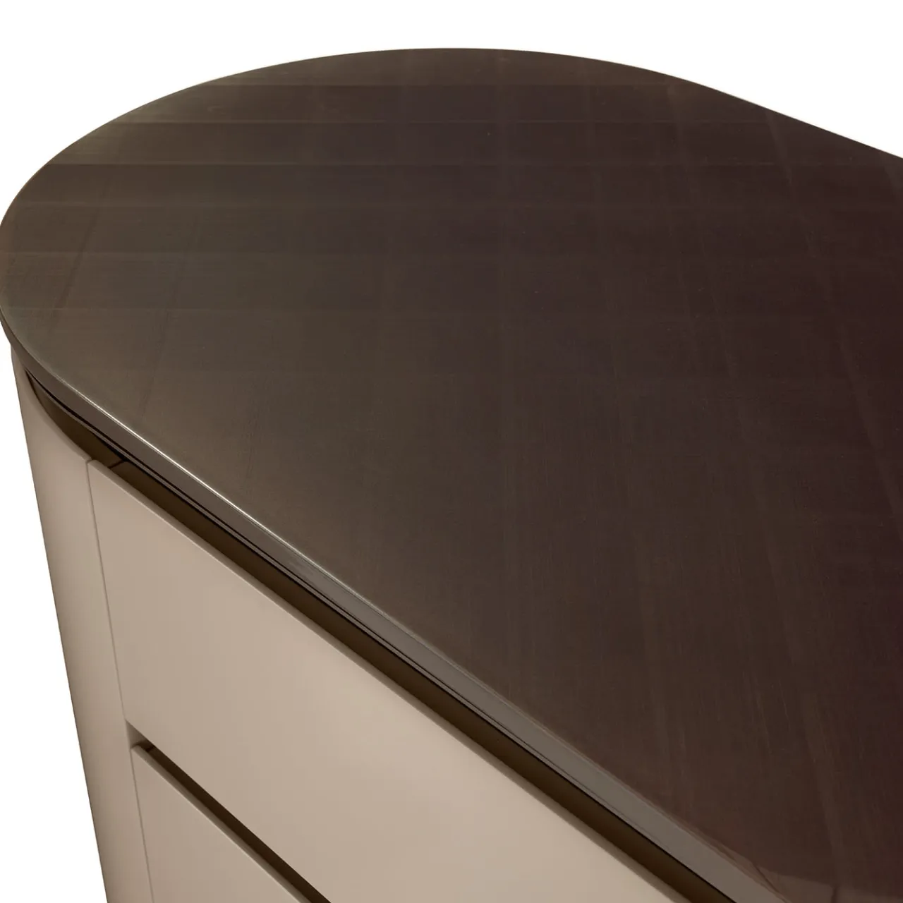 L’eleganza è al centro della scena in questo comò, caratterizzato da curve dolci e da una sapiente lavorazione artigianale. La silhouette arrotondata, meticolosamente realizzata in compensato e MDF, vanta una sofisticata laccatura Warm Grey con finitura opaca. Il piano in Biotite con laccatura spazzolata e finitura lucida completa il pezzo. I tre cassetti sono dotati di un sistema di chiusura ammortizzata. Contattando il nostro Concierge è possibile ottenere opzioni personalizzate, tra cui il materiale e la laccatura, in base alle proprie preferenze.