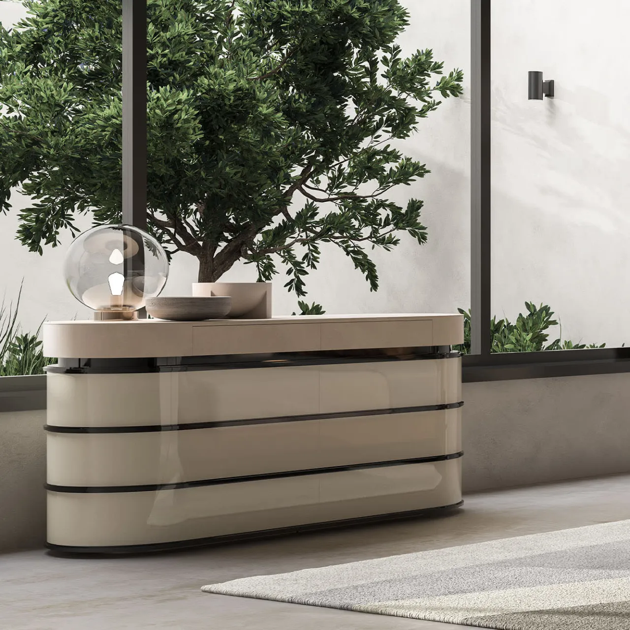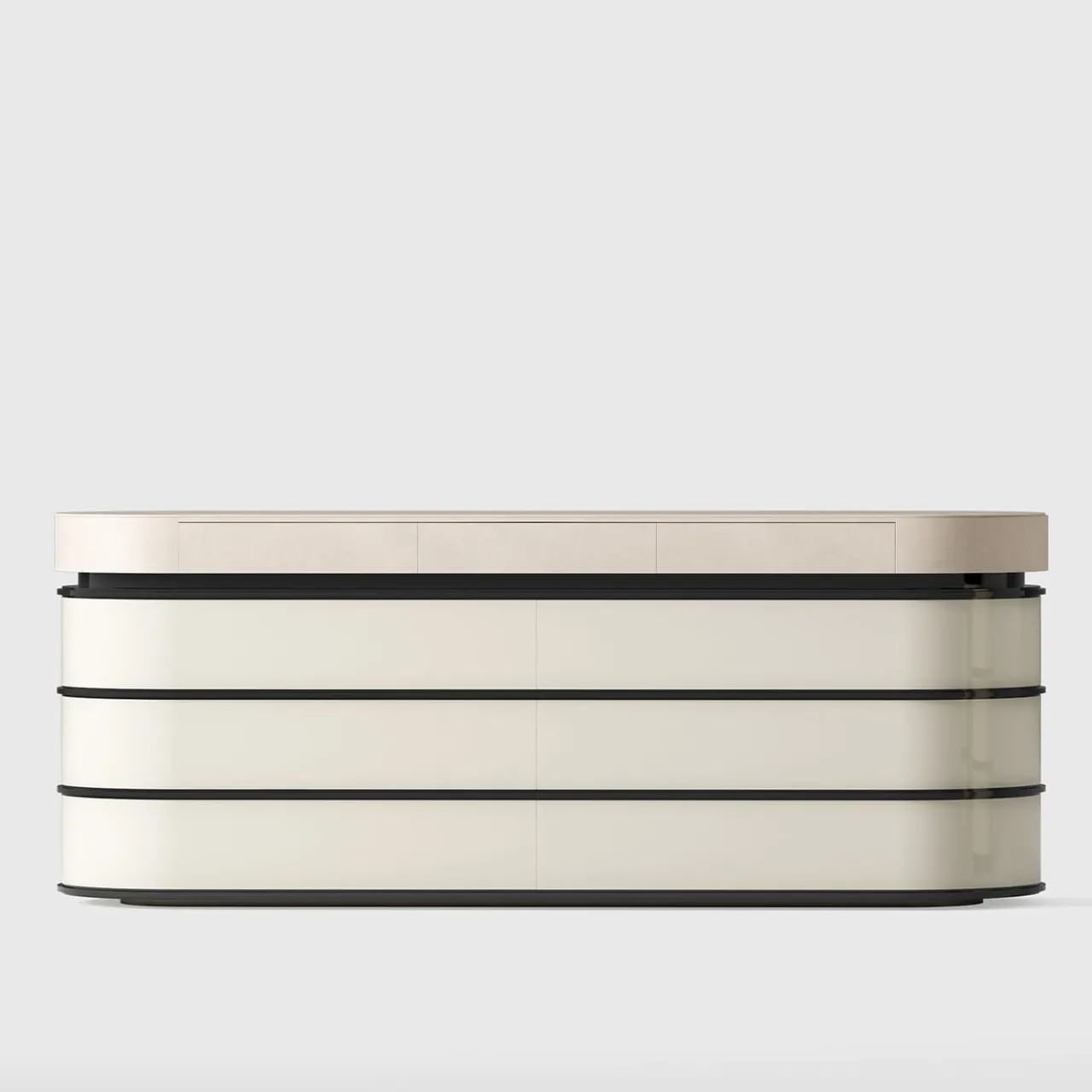 Il comò presenta una struttura in legno laccato, impreziosita da lussuosi dettagli in pelle. Il suo design elegante combina l’eleganza moderna con la praticità del contenimento, rendendolo un’aggiunta di stile a qualsiasi camera da letto o zona giorno.