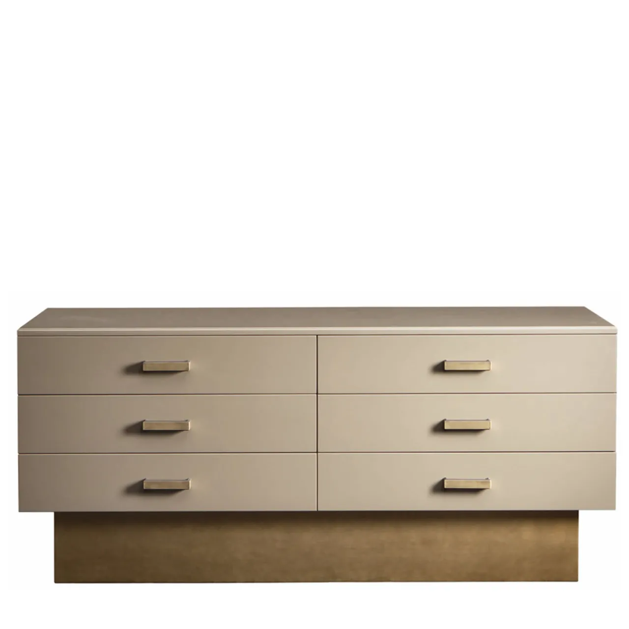 Dal design sorprendente, il comò Loft Double a 6 cassetti è composto da una struttura in multistrato e da un piano in legno laccato canapa, la base è laccata effetto ottone e le maniglie sono in ottone brunito.