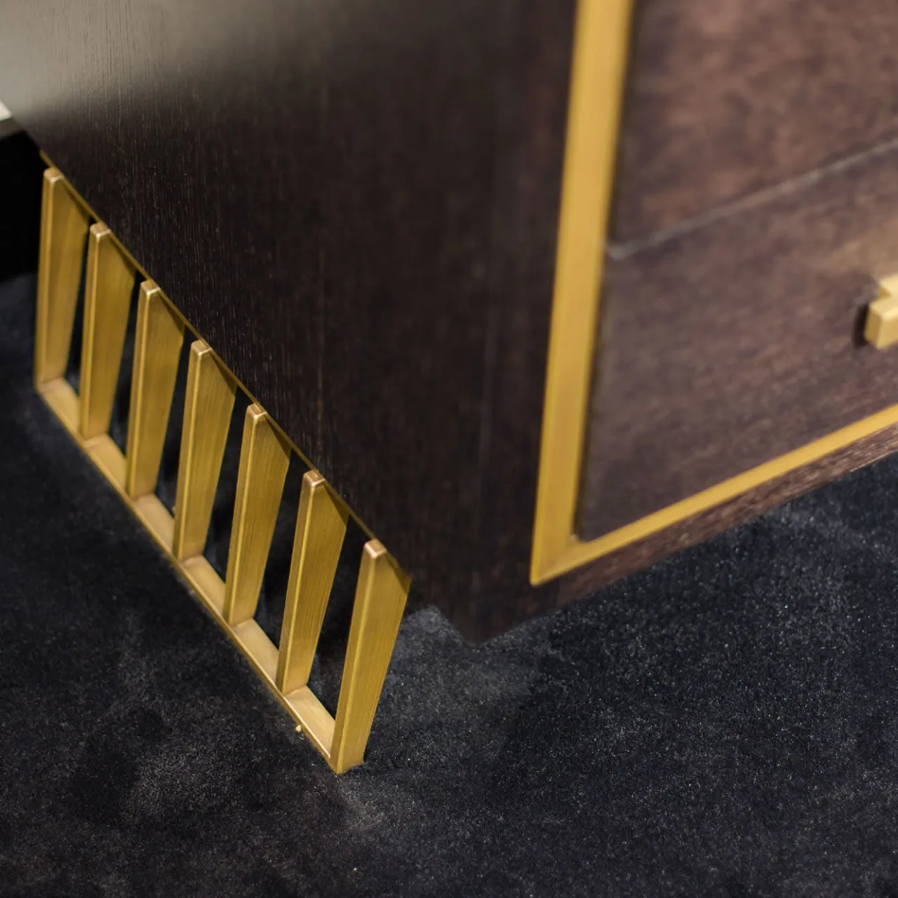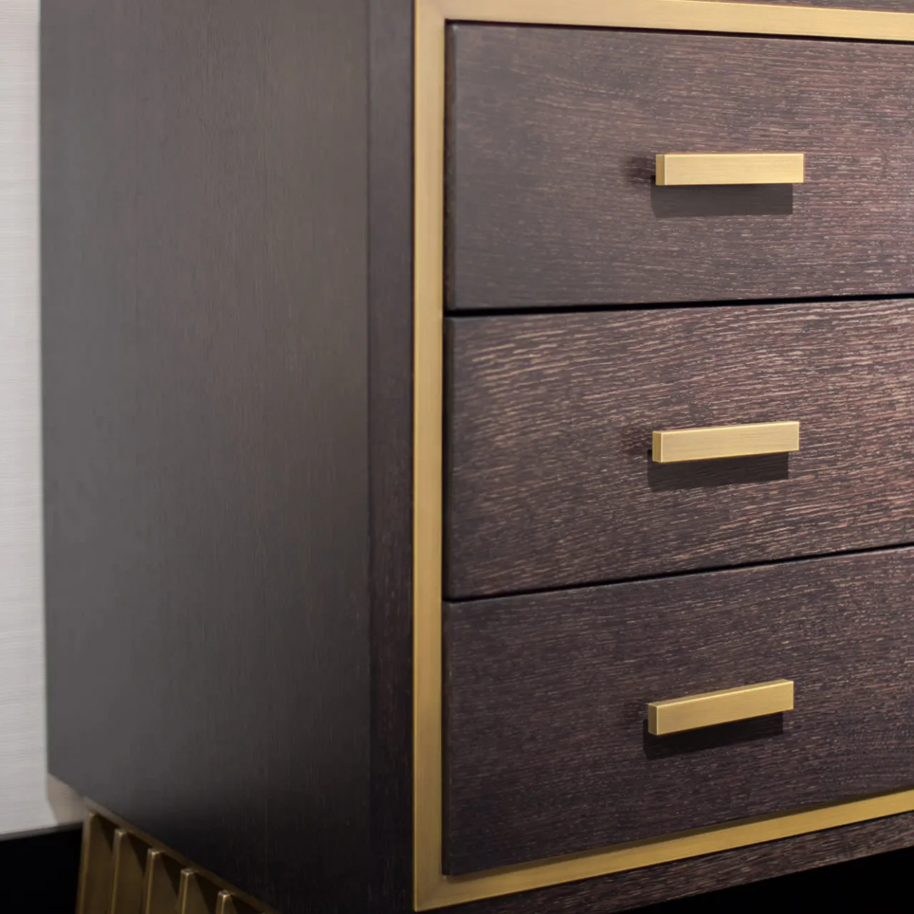 Poggiato su due gambe metalliche traforate con finitura in ottone, questo comò in legno emana un’eleganza sobria e si integra perfettamente in un’ampia gamma di interni raffinati. Composto da tre cassetti con maniglie in metallo finitura ottone, la struttura è realizzata in legno e mette in mostra le venature dai colori caldi, impreziosite da una sottile fascia metallica che incornicia il lato anteriore del comò. Sono disponibili altre opzioni di finitura sia per il metallo che per il legno; per maggiori dettagli, rivolgersi al Concierge.
