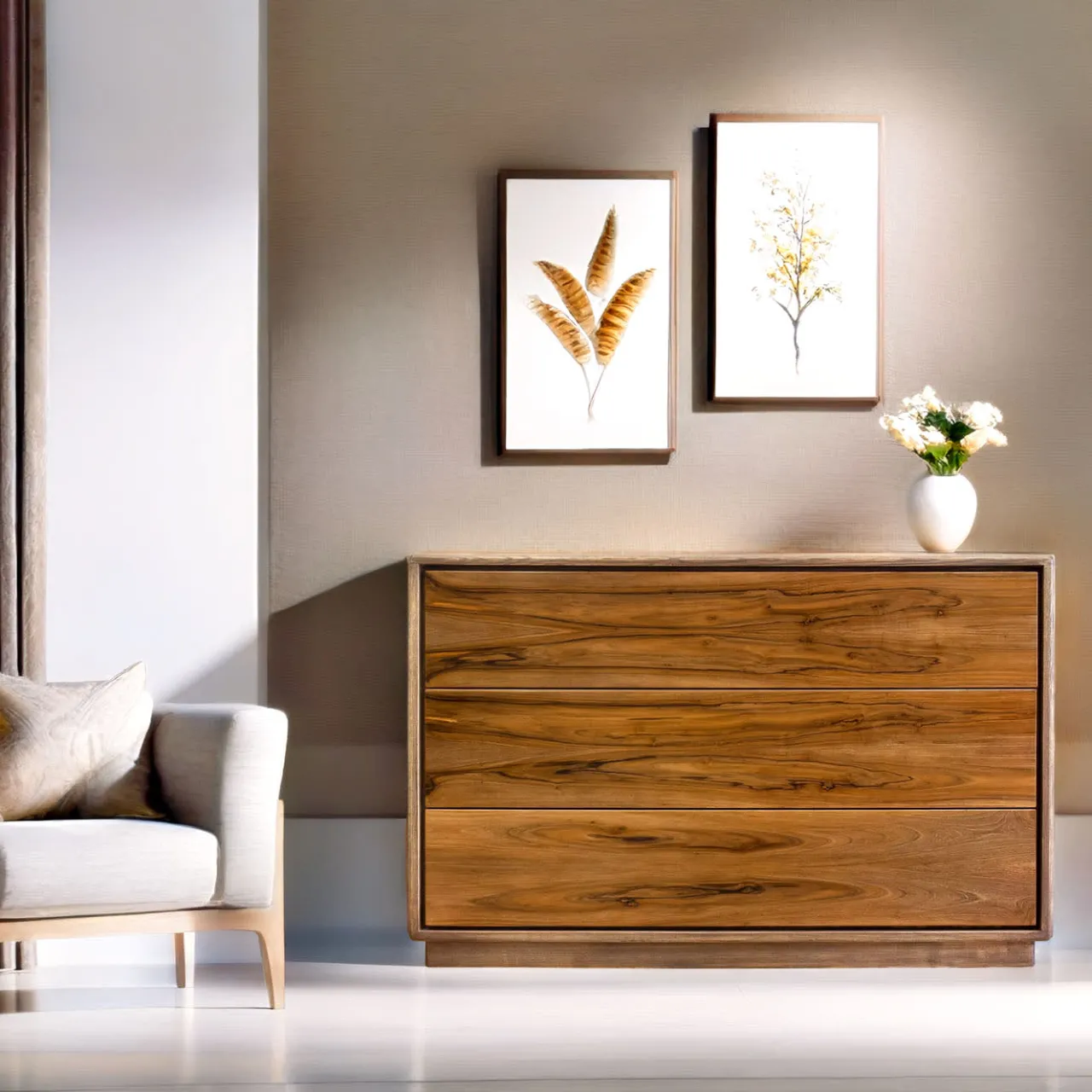 Le linee sobrie e pulite del comò Liv rivelano una costruzione impeccabile, progettata da Erika Gambella e realizzata da esperti artigiani con tecniche ebanistiche tradizionali. La robusta struttura in frassino con lucidatura a cera d’api opaca e satinata, poggia su una base incassata con piedini di livellamento e ospita tre ampi cassetti in faggio con frontali in noce gommato lucido, dotati di guide di scorrimento in metallo Blum e sistema di apertura Touch. Data l’elevata capacità di carico e la larghezza dei cassetti, le barre di stabilizzazione sono nascoste nella struttura.
