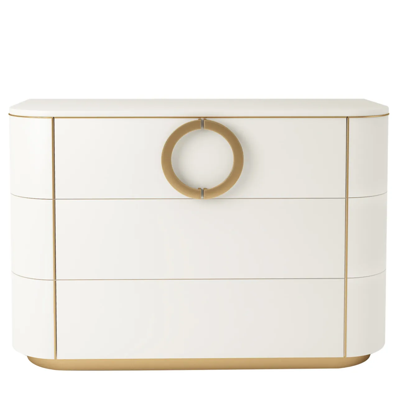 Disegnato da Isabella Costantini e realizzato da esperti artigiani italiani, il comò Maddalena è caratterizzato da tre spaziosi cassetti e da linee sinuose elegantemente arricchite da maniglie e profili in metallo. La base a zoccolo è un’aggiunta sofisticata che eleva il pezzo, che riporrà i vostri oggetti da giorno con stile. Accessori e dettagli: tre cassetti rivestiti in pelle ecologica. Finitura: laccato opaco avorio e dettagli in metallo con finitura ottone.