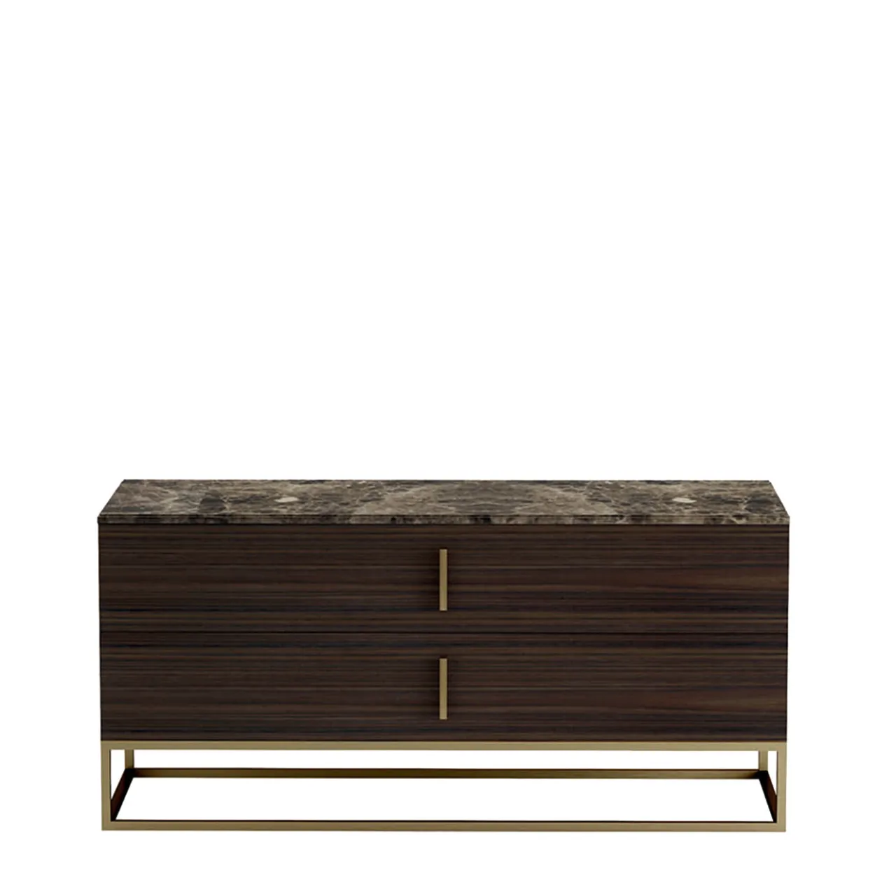 La silhouette slanciata e la palette di colori scuri di questa notevole cassettiera, che poggia su una base tubolare in ottone brunito, fondono stile e funzionalità. Due cassetti scorrevoli con maniglie in ottone brunito si aprono per rivelare un interno in tessuto. Realizzato in compensato con impiallacciatura in noce scuro e finitura lucida spazzolata, la struttura è sormontata da una squisita lastra rettangolare di marmo Emperador nelle tonalità complementari del marrone e del grigio, per una finitura raffinata che aggiungerà eleganza a qualsiasi camera da letto.