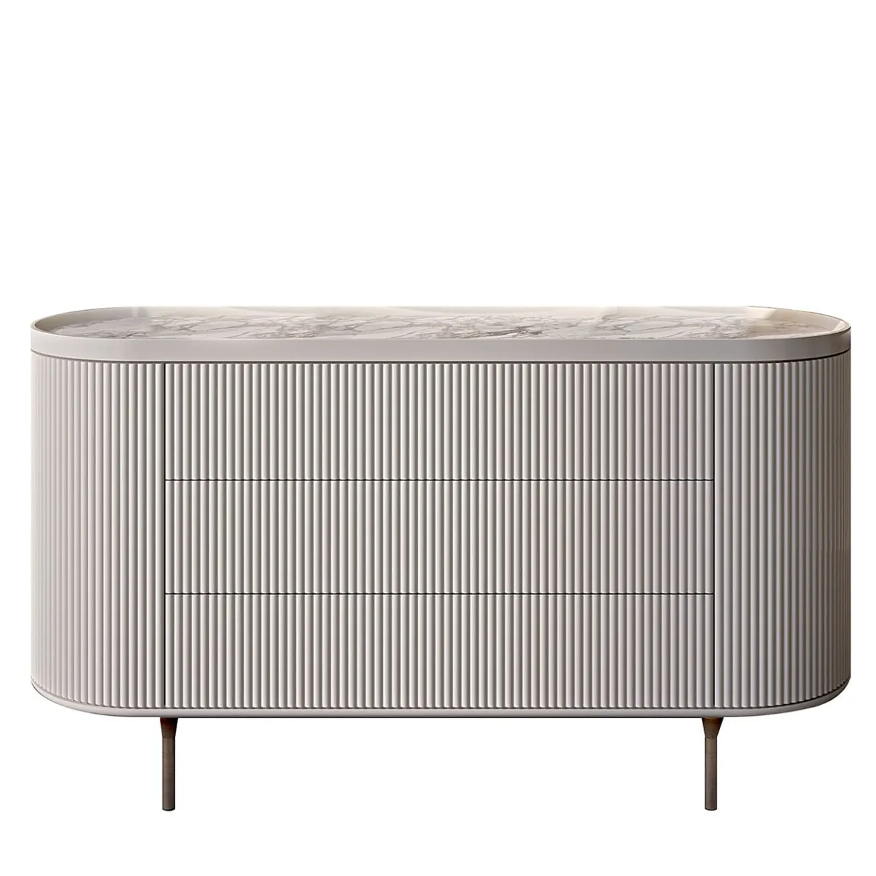 Sofisticatezza e luminosità si fondono in questo comò in legno, la cui laccatura bianca generale è ravvivata da un’accattivante texture canalizzata. Dotato di tre cassetti e sollevato su piedini in ottone brunito, la silhouette è resa armoniosa dai fianchi arrotondati e ulteriormente esclusiva dalla scelta della terracotta Calacatta Gold per il piano incassato. Per le personalizzazioni, contattare il Concierge.