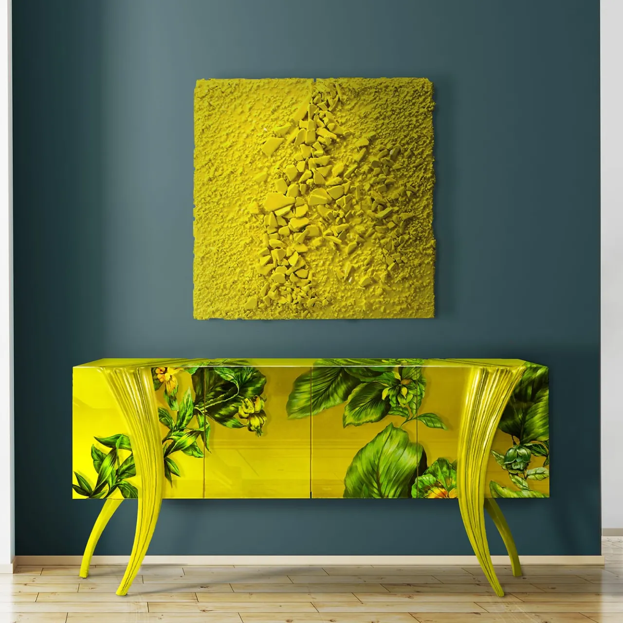 Carlo Rampazzi ha concepito questo progetto come uno scorcio di giardino botanico attualizzato in una credenza. L’ispirazione fitomorfa è rivelata dal disegno sinuoso e finemente intagliato delle gambe, che si armonizza con il motivo dei rami e delle foglie che si estendono lungo tutta la struttura in legno verniciato nei toni del verde e del giallo. Per maggiori dettagli sul tema botanico personalizzabile, consultare il Concierge.