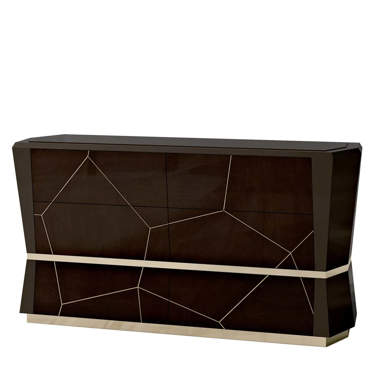 Questo comò presenta sei cassetti con dettagli in ottone e un piano in legno marrone opaco. Con la sua forma iconica quasi a diamante, arricchita dall’uso del legno esotico “Lati” sui cassetti. Le decorazioni irregolari sono incise a mano, completate da finiture in metallo di ottone liquido. Il tutto è completato da una fascia centrale e di base in metallo galvanico dorato. Chiedere al Concierge le opzioni di personalizzazione.