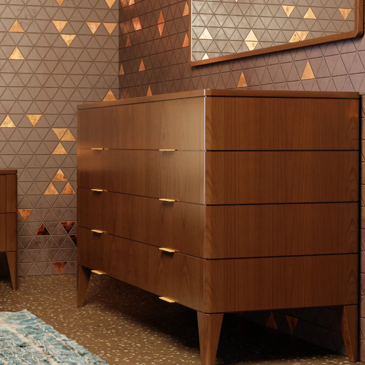 Il Comò Vittorio presenta quattro cassetti spaziosi con intricate lavorazioni fresate sui fronti e sui lati, unendo forma e funzione. Le sue gambe a stiletto affusolate rendono la silhouette raffinata, mentre le maniglie in ottone aggiungono un sottile accento metallico. Questo comò equilibra l’elegante artigianato con una pratica capacità di stoccaggio, adatto a un ambiente interno sofisticato. Disegnato da Centro Ricerche MAAM.
