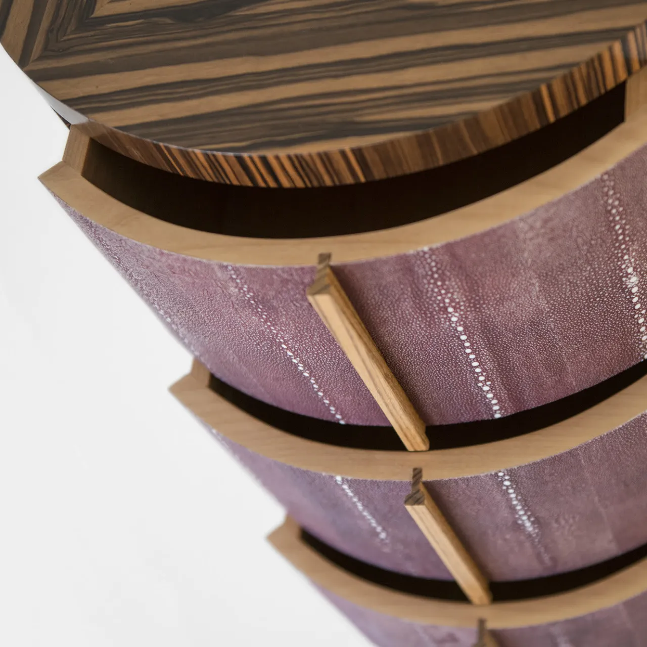 Questo comodino è dotato di tre cassetti per un ampio spazio di archiviazione e il suo perimetro esterno è stato interamente realizzato in legno di ebano macassar con motivi di taglio incrociato a 45 gradi e finitura mandorla. È inoltre dotato di una base in legno di zebra che colpisce per le sue eleganti venature. Il lato anteriore è impreziosito da inserti intrecciati in galouchat e pelle tinta in rosso vino. La maniglia è in massello di zebrano. Disegnato da Antonio Berdondini, anno 1941.