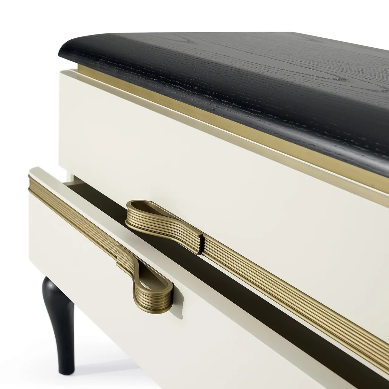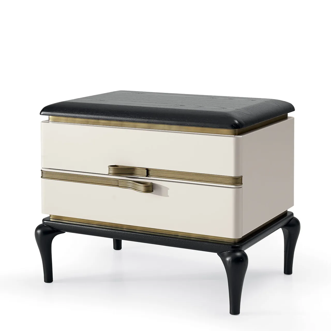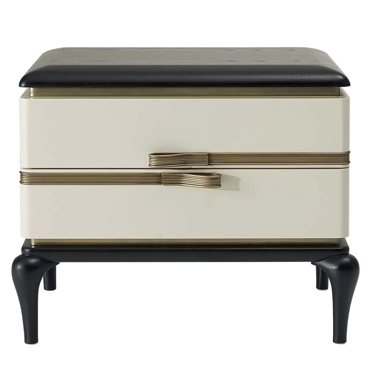 Elegante e robusto complemento d’arredo funzionale, questo comodino emana un’allure moderna nella sua combinazione di bianco e nero e ottone brunito. Piccolo e dotato di due cassetti, è composto da una struttura in multistrato laccato bianco e MDF rivestito in frassino, racchiusa tra un piano in frassino massiccio laccato nero e sinuose gambe in stile cabriole.