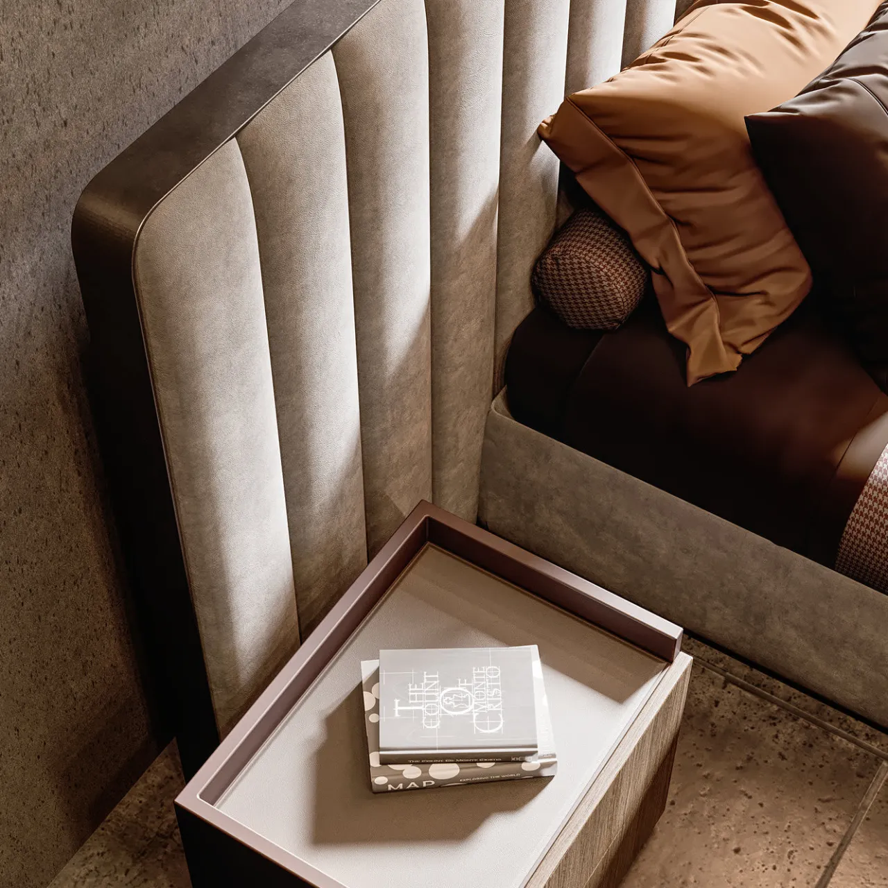 Questo comodino decisamente moderno, che ricorda il design della metà del secolo scorso, è un complemento perfetto per gli arredi dai toni neutri, suggerito in coppia con la credenza Keith. La sua struttura squadrata in legno è laccata in una nuance scura che si armonizza perfettamente con la preziosa impiallacciatura in rovere dei due cassetti push-and-pull.