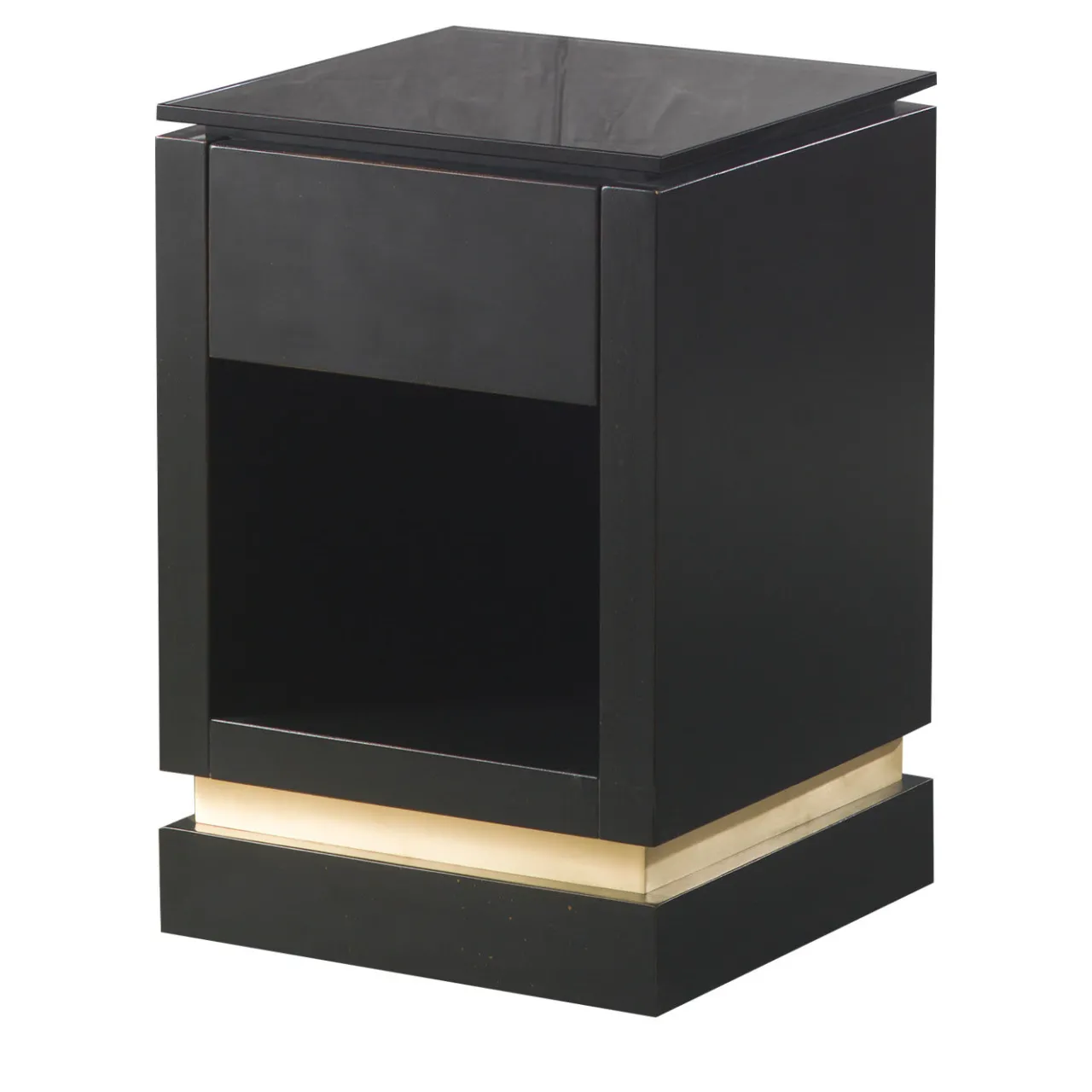 Il comodino Cube conferisce un’atmosfera moderna alla camera da letto, definita da linee pulite e da una silhouette sorprendente. La sua struttura in legno nero è sormontata da un piano in vetro fumé e da un inserto alla base in ottone spazzolato. Un pratico armadietto offre spazio per libri, riviste e oggetti essenziali per la notte.