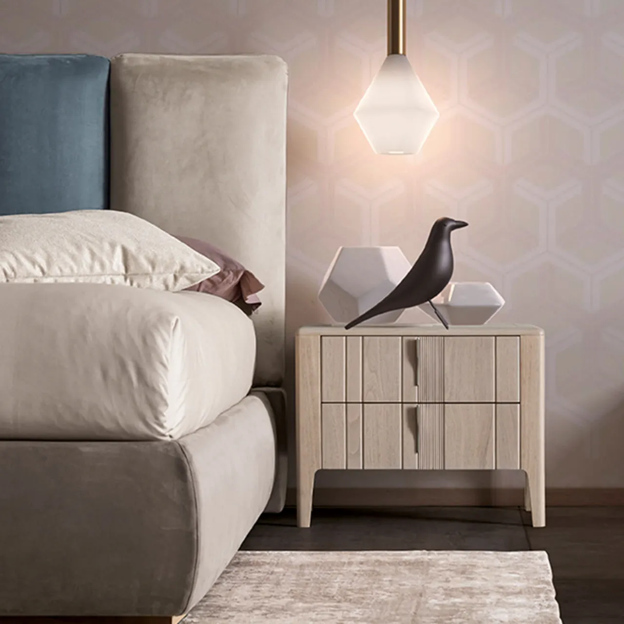 Realizzato in pregiato noce canaletto, qui ravvivato da una finitura all’acqua di colore beige, questo comodino affiancherà con eleganza letti di ispirazione moderna. Un aspetto a doghe ulteriormente arricchito da scanalature lineari caratterizza la coppia di cassetti con chiusura ammortizzata, il cui design è completato da essenziali maniglie in nichel. I piedi leggermente affusolati sigillano il pezzo. Per la controparte cassettiera, consultare il catalogo Artemest.