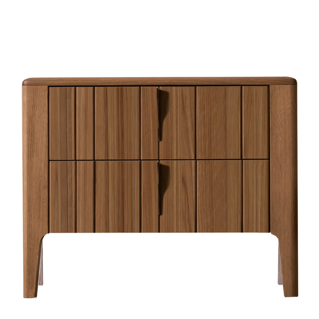 Caratterizzato da doghe a righe verticali in noce canaletto liscio, il comodino Domino è una celebrazione del legno naturale. Con la finitura Havana di Modo10, le venature del legno risplendono, diventando l’elemento caratterizzante dell’intero pezzo. Con due cassetti, il comodino è disponibile con maniglie a scelta in nichel, bronzo o canna di fucile. Qui raffigurato con il bronzo.