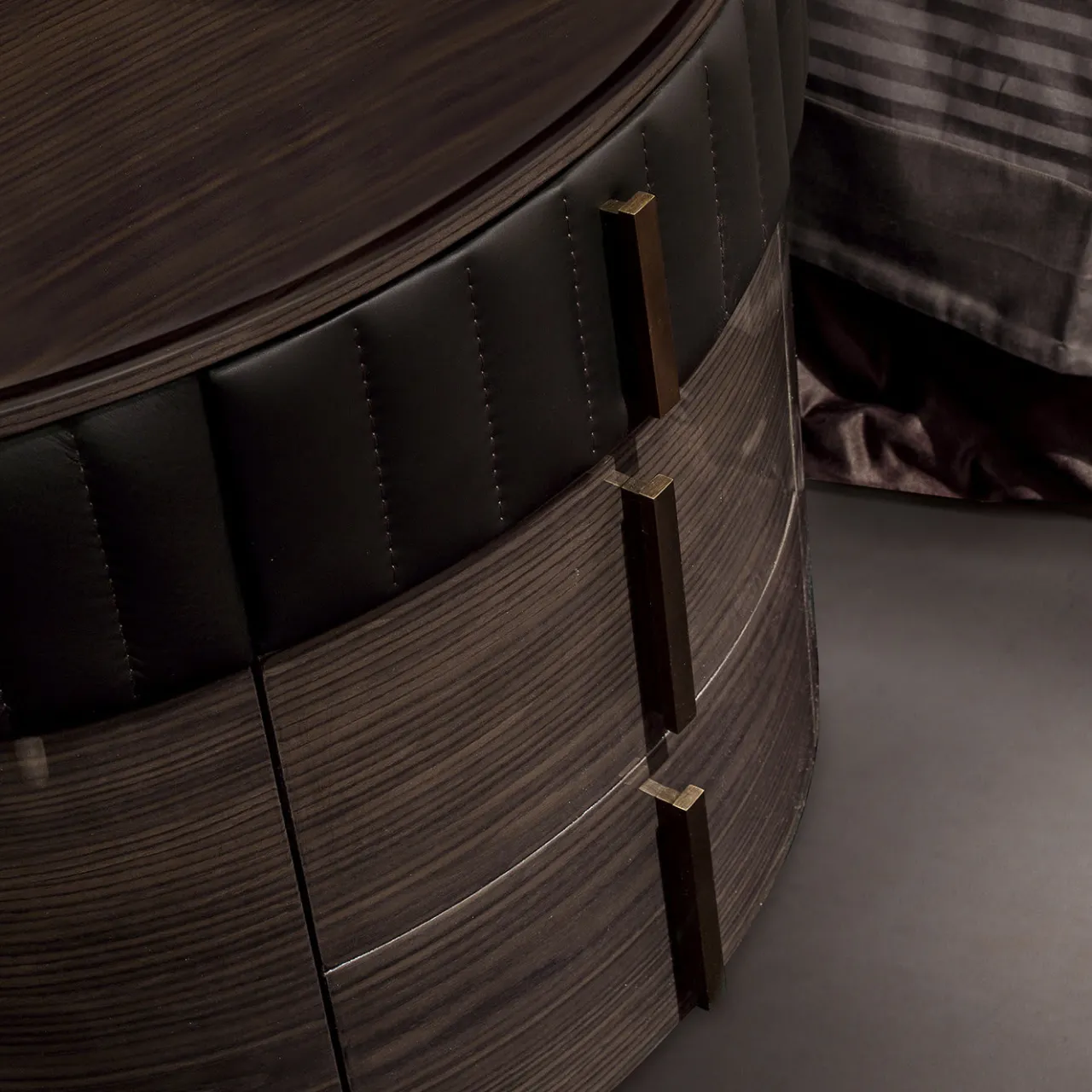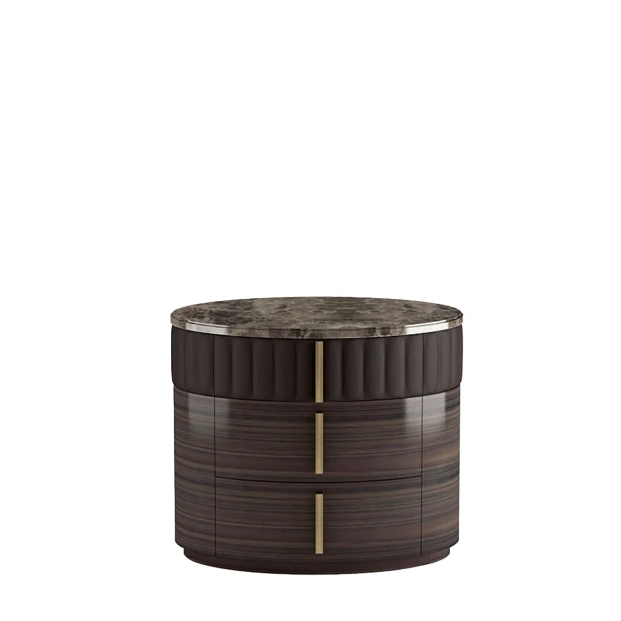 Semplice ed elegante, questo comodino cilindrico in multistrato con impiallacciatura in noce scuro e finitura lucida spazzolata è sostenuto da una base a plinto incassata. Il piano in marmo Emperador è completato da un ampio bordo in pelle marrone con disegno in gros grain. Tre cassetti rivestiti in tessuto scorrono senza fatica su morbide guide metalliche e sono impreziositi da maniglie in ottone brunito. Una struttura minimalista che eleva qualsiasi camera da letto a una lussuosa raffinatezza.