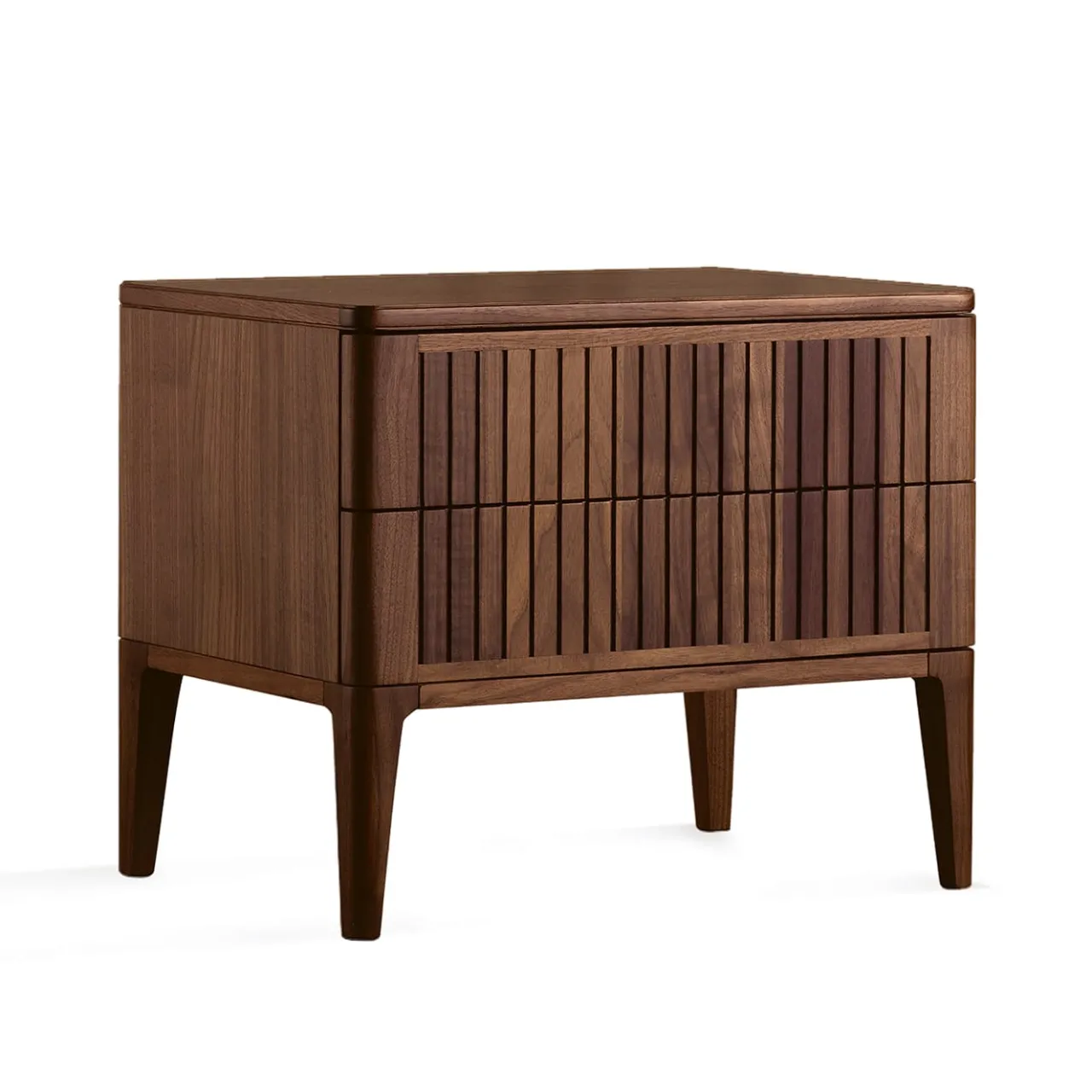 I comodini in legno massello Eleva combinano un raffinato design italiano e una sapiente lavorazione artigianale. Le ante frontali, realizzate in noce massello di prima qualità con finitura acrilica, creano un intrigante contrasto tra luci e ombre grazie a uno stile lineare.